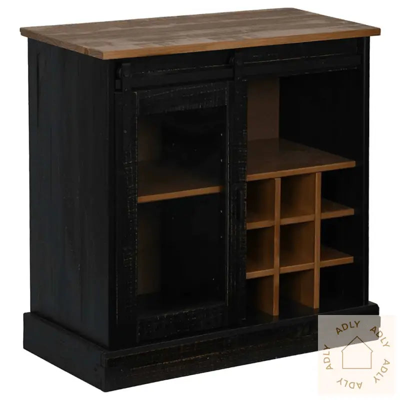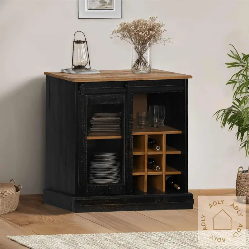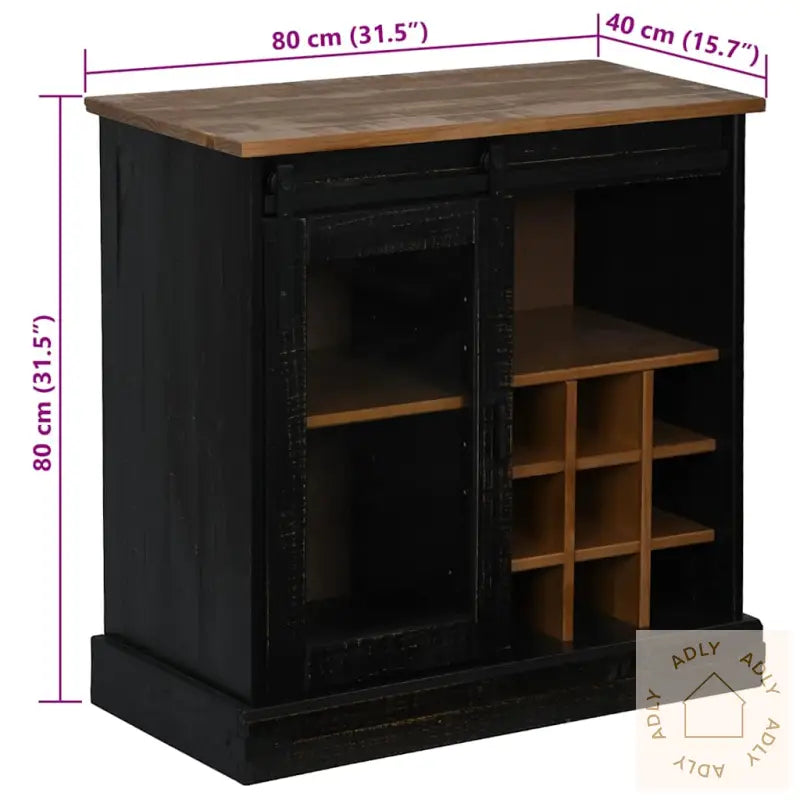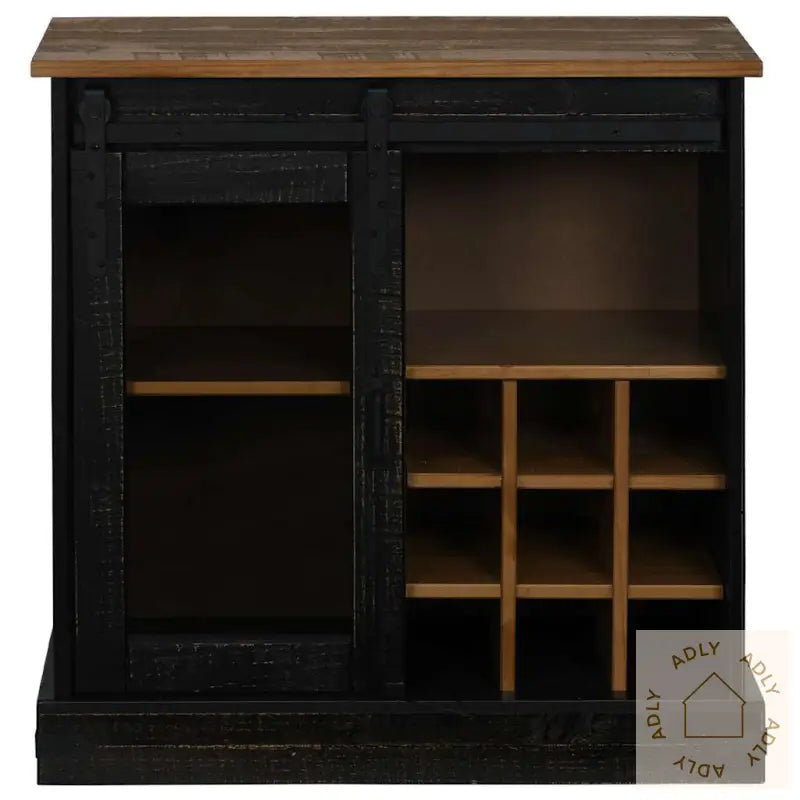 For å unngå at skjenken velter, husk å bruke den medfølgende festeløsningen mot vegg.Farge: svartMaterialer: heltre furu, metallStørrelse: 80 x 40 x 80 cm (B x D x H)En skyvedør og ni vinflaskeholdereKolleksjon: HALDENMontering kreves