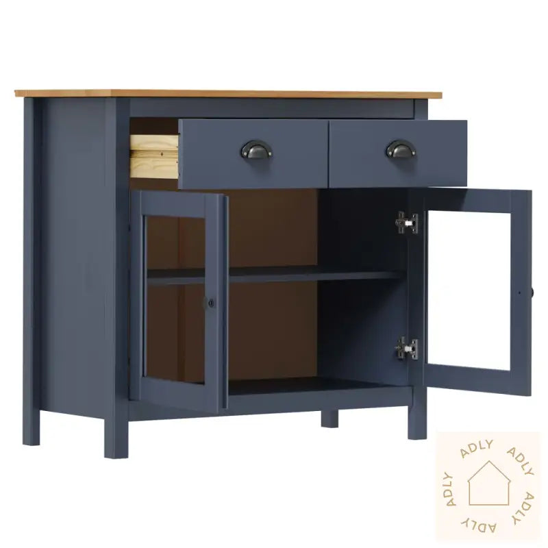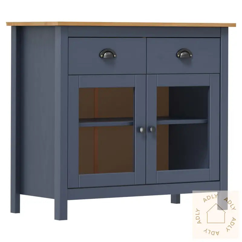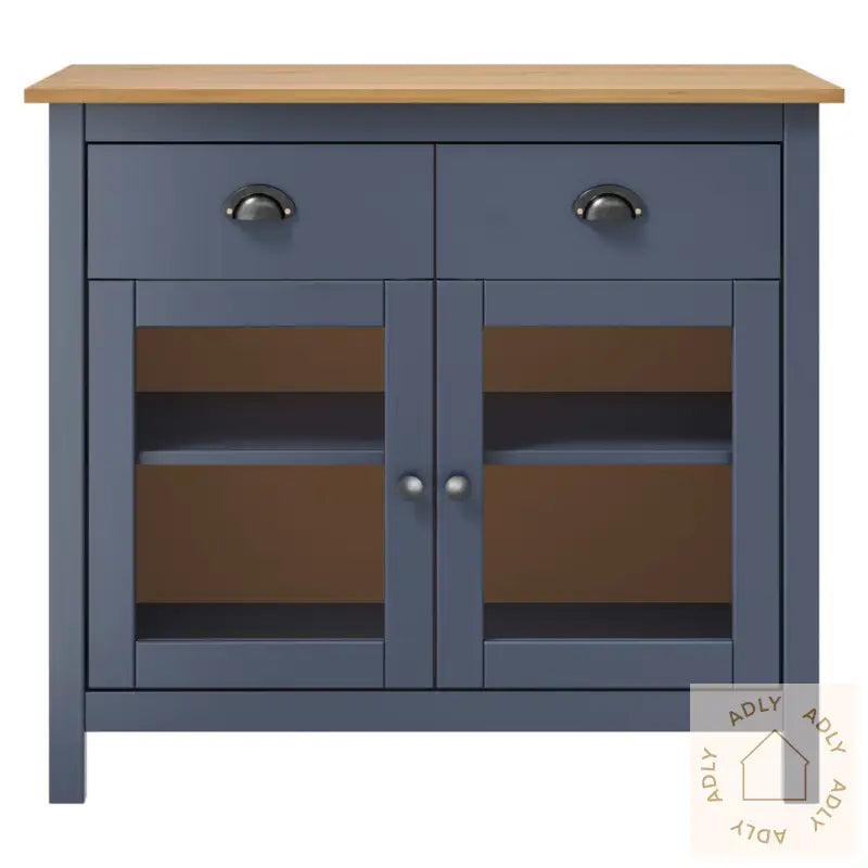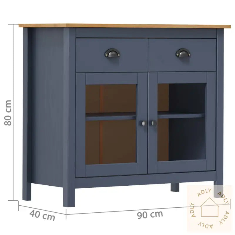 Farger: grå og honningbrunMateriale: heltre furu for stabilitet og lang levetidMål: 90 x 40 x 80 cm (B x D x H)Utstyrt med 2 skuffer, 2 hyller og 2 glassdører, perfekt for smart og praktisk lagringSkuffene leveres med stoppere for ekstra sikkerhetMontering kreves: ja