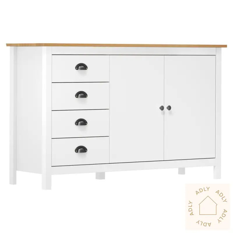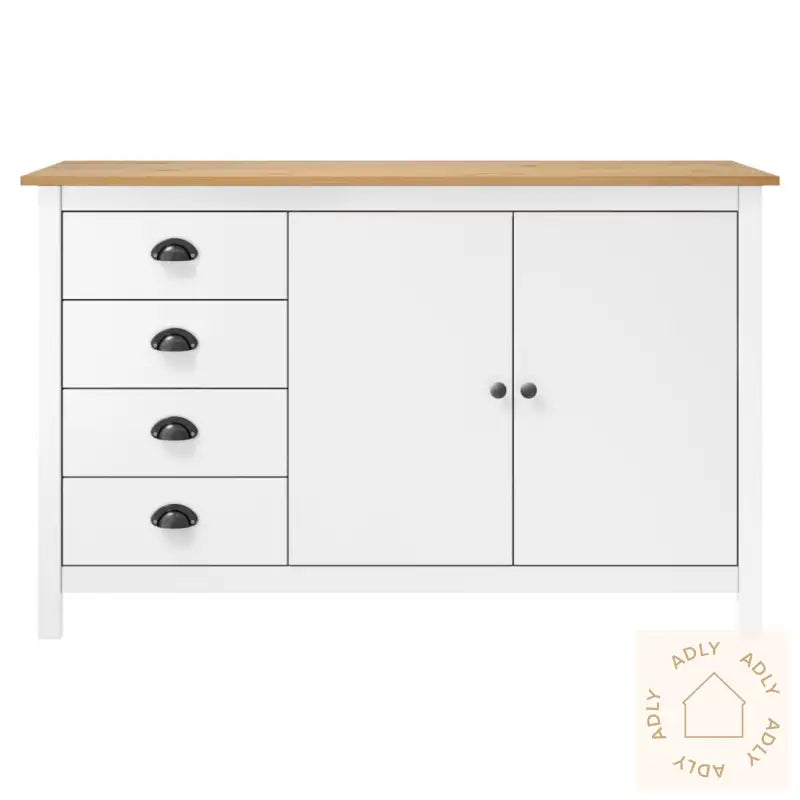 Skjenken er produsert av robust heltre furu, noe som gir både stabilitet og lang levetid. De klassiske kopphåndtakene på de fire romslige skuffene gir enkel tilgang og ekstra sjarm. Med to dører og fire skuffer har du god plass til å oppbevare alt fra servise og bestikk til tepper, dokumenter eller det du trenger å ha lett tilgjengelig hjemme. Denne skjenken gjør det enkelt å holde orden og utnytte plassen maksimalt – samtidig som den tilfører varme detaljer til innredningen med kombinasjonen av hvitt og honningbrunt treverk.