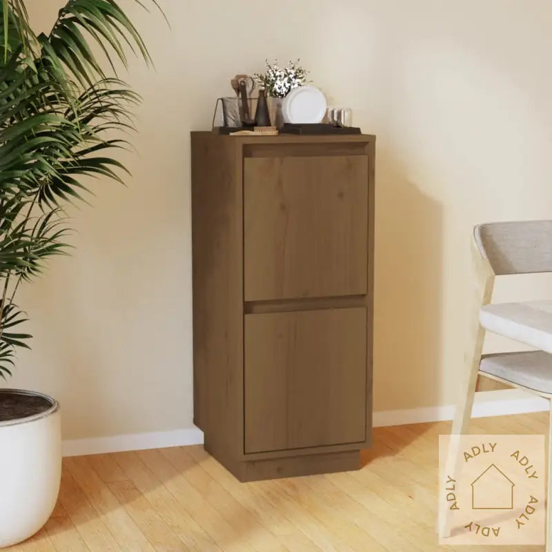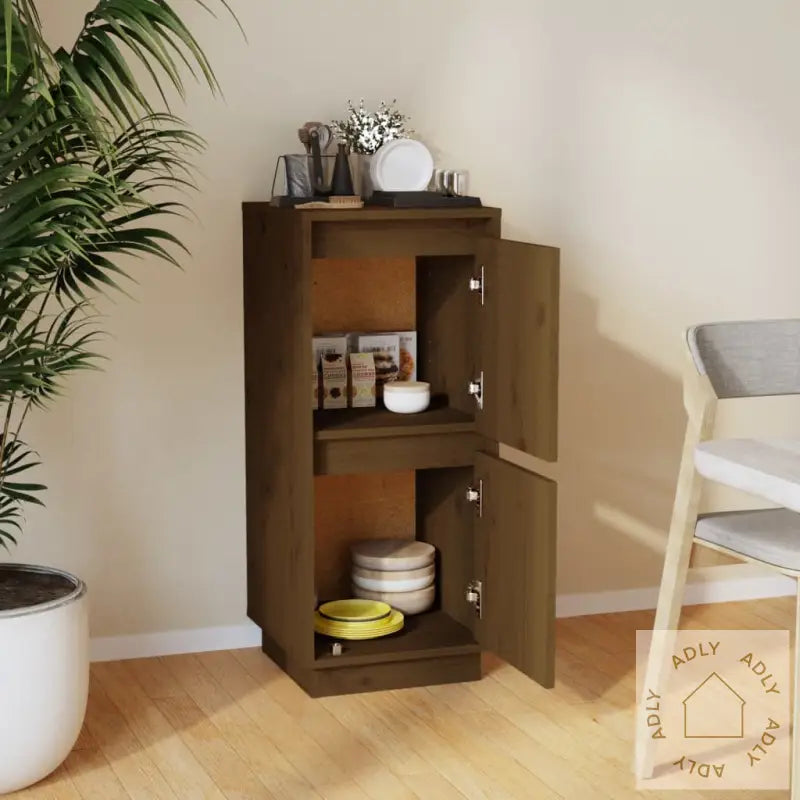 Farge: honningbrunMaterialer: heltre furu, MDFMål: 31,5 x 34 x 75 cm (L x B x H)Montering kreves: ja