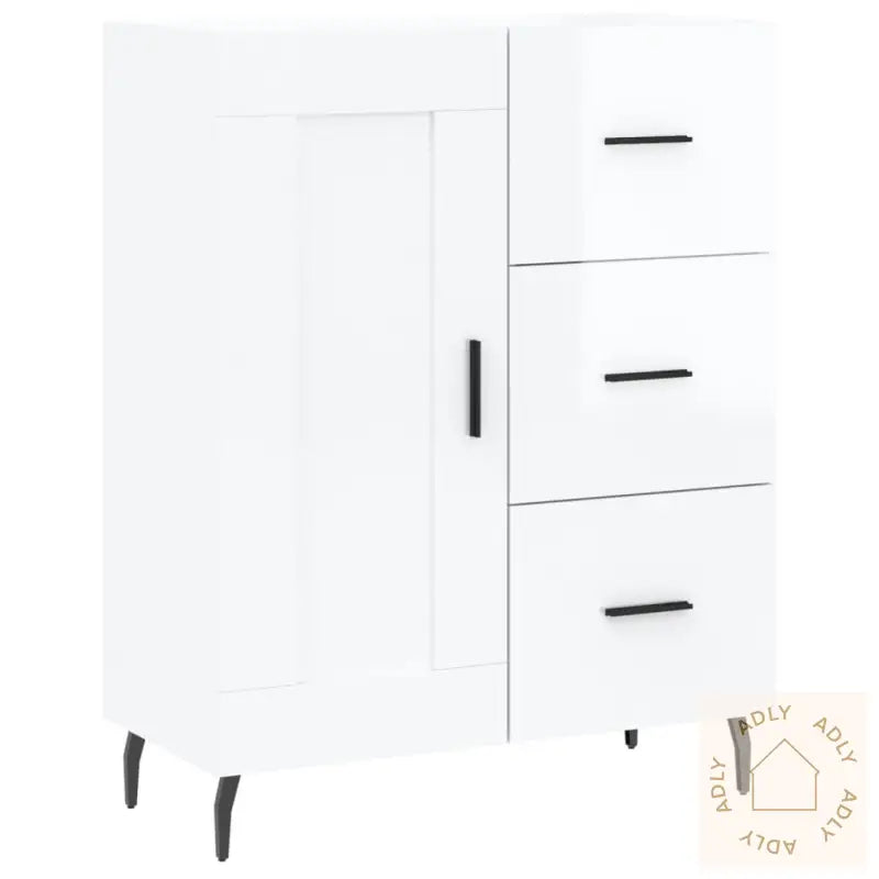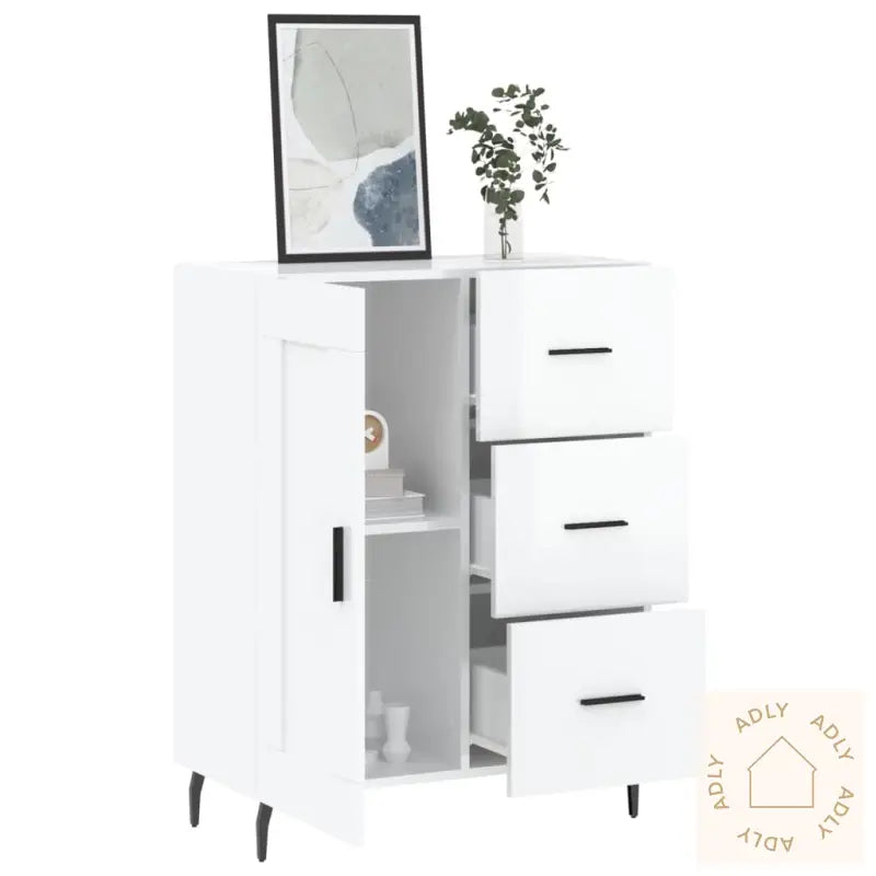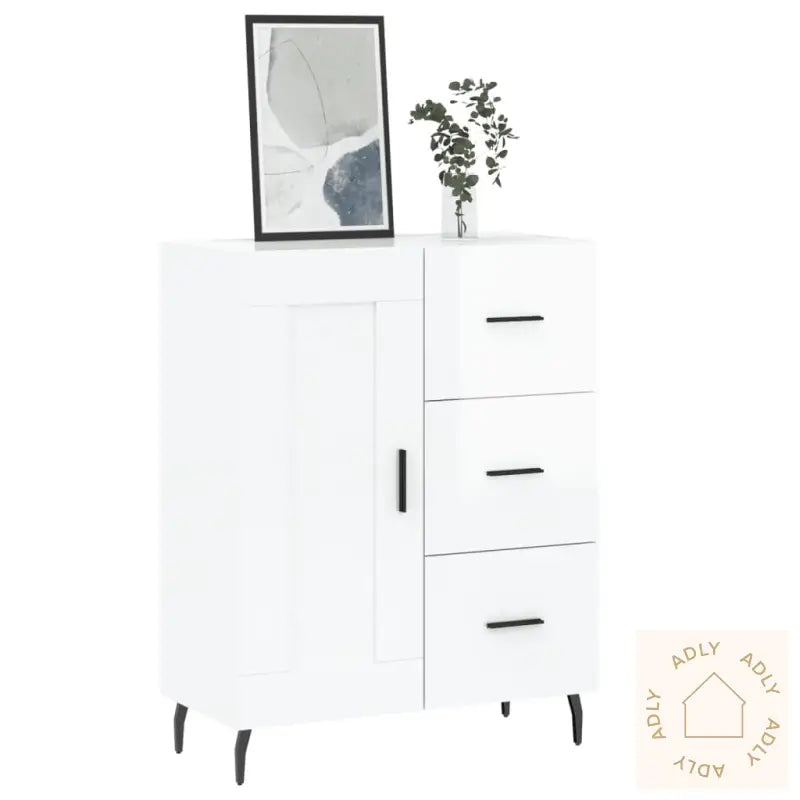 Slitesterkt materiale: Skjenken er laget i konstruert treverk av svært god kvalitet. Overflaten er glatt og lett å holde ren, samtidig som materialet gir møbelet solid styrke, god stabilitet og lang levetid. I tillegg motstår den fuktighet, noe som øker holdbarheten – perfekt for travle hverdager.Rikelig oppbevaringsplass: Med to rom og tre skuffer får du gode muligheter til å organisere alt fra servise til småting, slik at hjemmet ditt ser ryddig ut. Her får du enkelt oversikt og alt er innen rekkevidde når du trenger det.Visningsmuligheter: Toppen av skjenken gir en flott mulighet til å vise frem favorittdekor, grønne planter, eller bilderammer som bidrar til å gi møbelet og rommet et personlig uttrykk.Praktiske dører og håndtak: Dørene sørger for at tingene dine holder seg støvfrie, mens de brukervennlige håndtakene på skuffer og dører gjør det enkelt å få tilgang til alt du har lagret.Metallben: Elegante metallben gir skjenken et moderne preg, samtidig som de sørger for at møblet står støtt og stabilt på gulvet. Metallbena gjør dessuten at skjenken passer inn i både klassiske og mer moderne hjemmemiljøer.Advarsel: