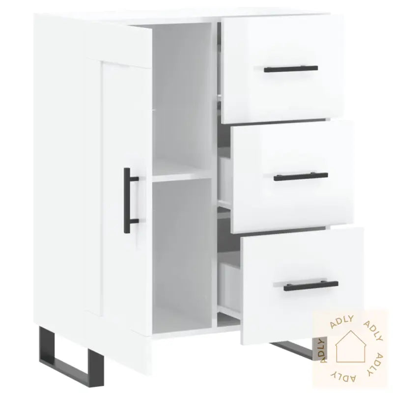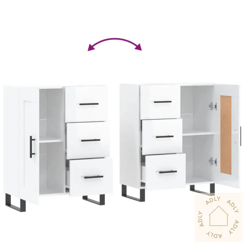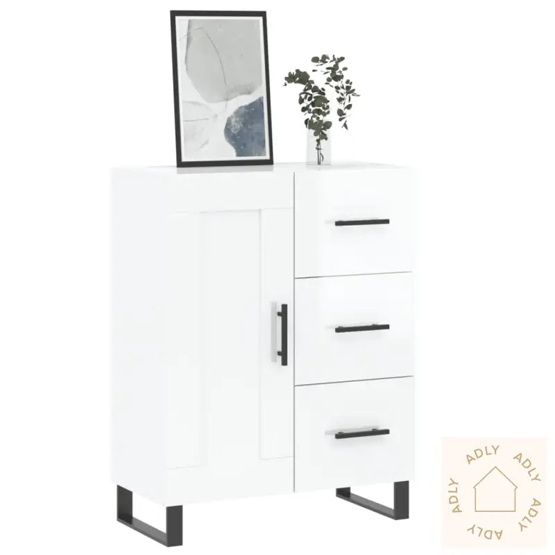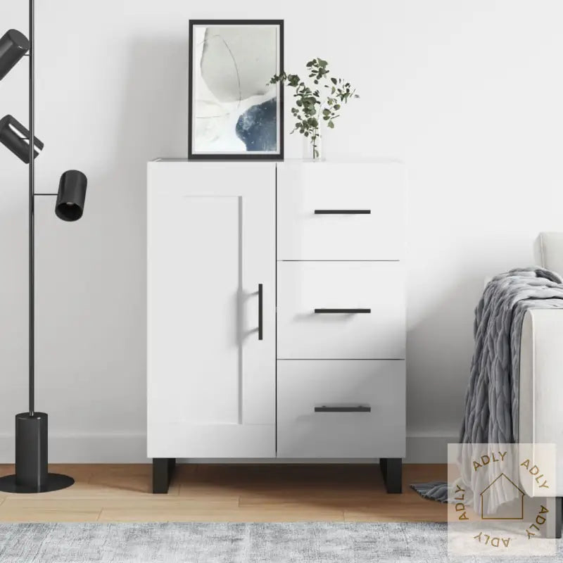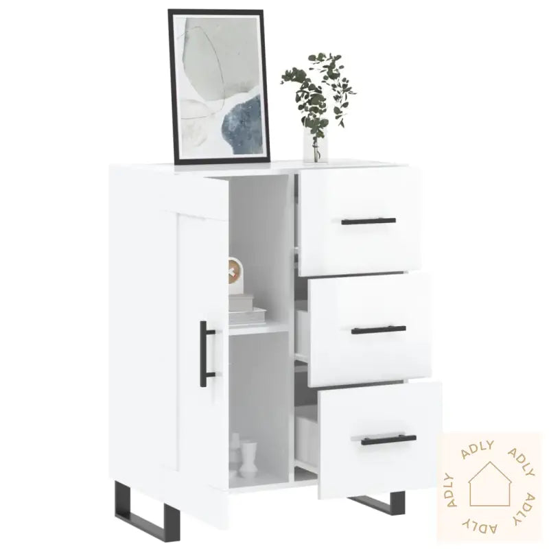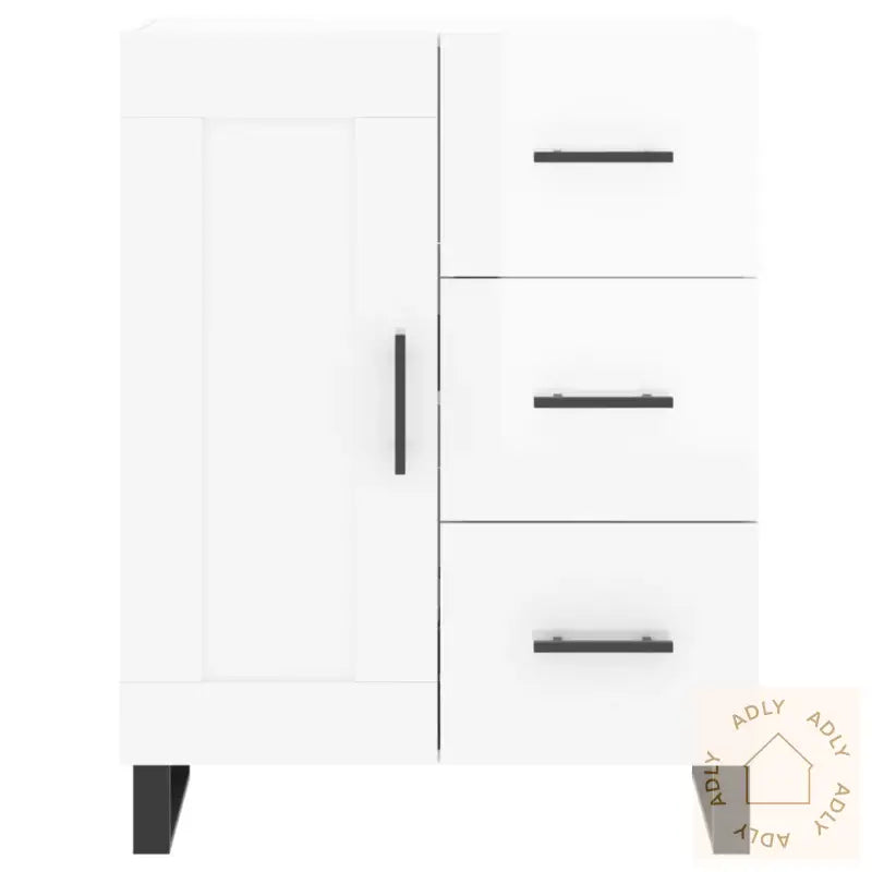 Slitesterkt materiale: Skjenken er laget i konstruert tre av høy kvalitet, kjent for sin glatte overflate og robuste konstruksjon. Materialet gir både styrke og stabilitet, og tåler daglig bruk uten problemer. Samtidig er det motstandsdyktig mot fuktighet, noe som gjør dette til et praktisk valg blant moderne møbler.Rikelig med oppbevaringsplass: Med to rom og tre skuffer får du god plass til å organisere alt fra bøker til servise og andre hverdagslige nødvendigheter. Dette gjør det lettere å holde hjemmet ryddig og samle eiendeler på ett sted, så alt er lett tilgjengelig når du trenger det.Visningsfunksjon: Toppen på skjenken er ideell for dekorering med potteplanter, innrammede bilder, lys eller andre små dekorative gjenstander. Dette gir deg muligheten til å sette ditt eget personlige preg på interiøret, slik at dine møbler gjenspeiler din stil.Praktiske dører og håndtak: Dører og håndtak beskytter tingene inni mot støv og holder alt skjult for et ryddig uttrykk, mens de solide håndtakene gjør det superenkelt å åpne både skuffer og skap – så du alltid har enkel tilgang til oppbevaringsplassen.Metallben: Stilrene metallben gir skjenken et moderne og avslappet preg, samtidig som de sørger for ekstra stabilitet og holdbarhet. Benene hever møbelet, noe som også gjør det lettere å rengjøre under.Advarsel: