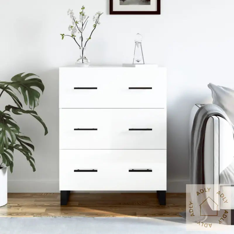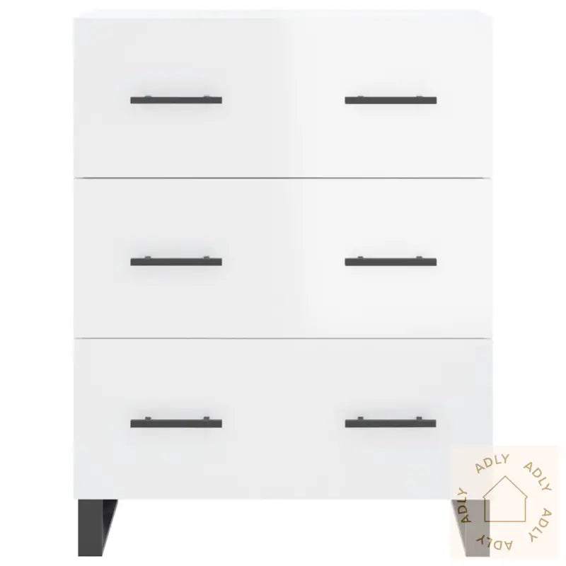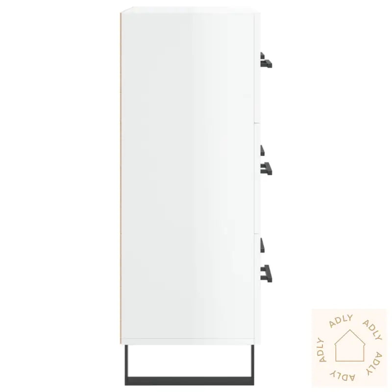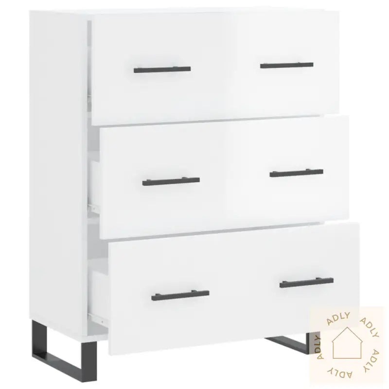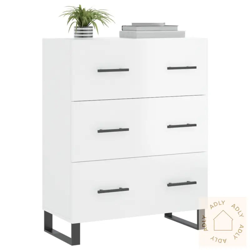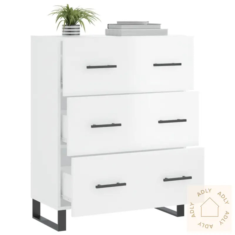 Solid materiale: Det konstruerte treverket holder høy kvalitet og har en glatt overflate. Her får du styrke, stabilitet og god motstand mot fuktighet – praktisk for deg som vil ha møbler som varer og krever lite vedlikehold.Rikelig oppbevaring: Skjenken har tre romslige skuffer, så du får masse plass til å organisere alt fra servietter og duker til småting i hverdagen. Perfekt når du vil ha orden hjemme og samtidig ha alt lett tilgjengelig.Visningsfunksjon: Den solide oversiden av møbelet gir god plass til å vise fram pyntegjenstander, fotorammer eller grønne planter, og lar deg enkelt gjøre rommet mer personlig. Denne skjenken passer like bra sammen med andre møbler eller ved siden av bokhyller og stående hyller.Metallføtter: Oppbevaringsskapets metallføtter gir et moderne uttrykk som står godt til både klassiske og moderne interiørstiler. De sikrer også at skjenken står stødig på gulvet – så her får du både design og sikkerhet i ett.Advarsel: