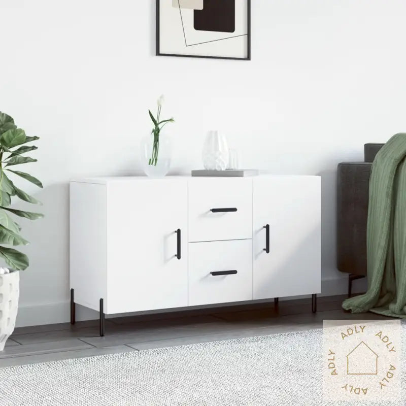 Slitesterkt materiale: Med konstruert tre av høy kvalitet får du en glatt overflate som føles solid og trygg. Materialet gir skjenken både styrke og stabilitet, og gjør at den er motstandsdyktig mot fuktighet – perfekt for langvarig bruk sammen med dine andre møbler.Moderne metallben: De robuste bena i metall gir et elegant, moderne uttrykk som glir rett inn i dagens interiørtrender, uansett om du liker skandinavisk eller mer klassisk stil. Metallbena sørger for at skjenken står stødig og tåler daglig bruk.God lagringsplass: Med romslige hyller og skuffer får du enkel tilgang til alt fra bøker og servise til mindre ting som fjernkontroller og magasiner. Det blir lettere å organisere ditt hjem, slik at det alltid er ryddig og oversiktlig.Stabil topp for dekor: Toppflaten er solid nok til at du trygt kan vise frem bilder, blomsterpotter eller andre dekorative detaljer. Dette gir et personlig preg blant dine eksisterende møbler til hjemmet.Praktiske dører med håndtak: Hold tingene dine skjult for støv og rot, men lett tilgjengelige. Dørene og skuffene har smarte håndtak, så det er enkelt å åpne og lukke oppbevaringsskapet – ideelt for travle hverdager.Advarsel: