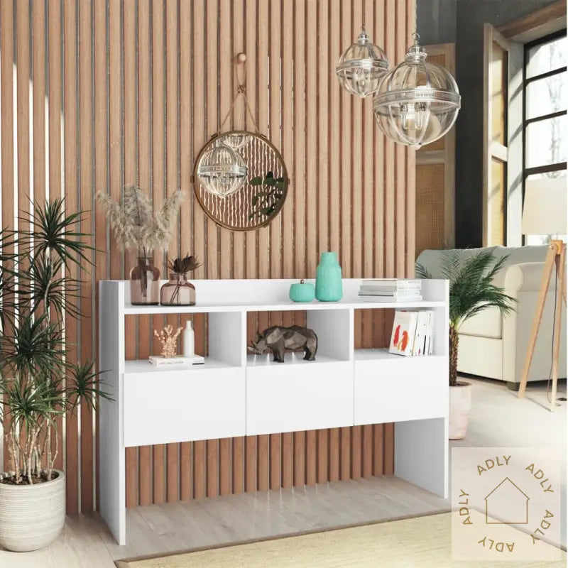 Skjenken har god oppbevaringsplass med 3 åpne rom og 3 praktiske skuffer – perfekte for alt fra bøker, multimedieapparater til småting du vil ha lett tilgjengelig. Den solide bordplaten gir deg en flott mulighet til å vise frem dine favorittdekorasjoner, familiebilder eller grønne planter, og gjør det enkelt å variere uttrykket etter sesong og stil. Skjenken er laget i konstruert tre av høy kvalitet, noe som sørger for at den er både slitesterk og enkel å holde ren. Dette er et funksjonelt møbel som kombinerer smart oppbevaring med et tidløst design, og passer derfor like godt i stua som i gangen, kjøkkenet eller på kontoret.