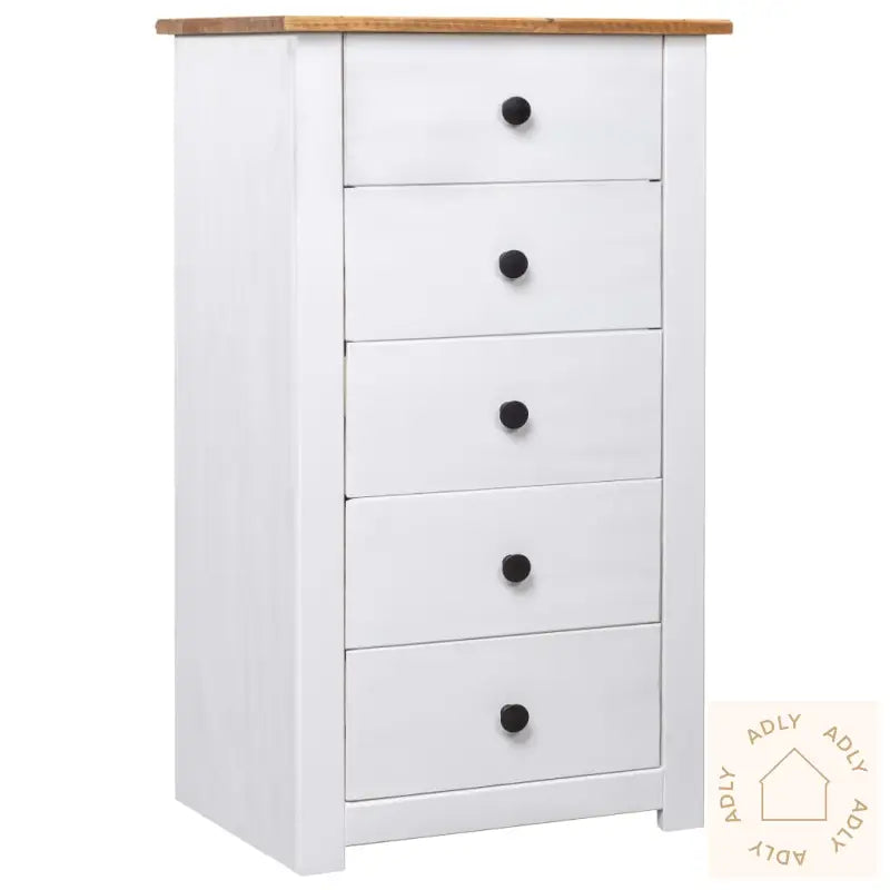 Farge: hvitMateriale: heltre furuMål: 46 x 40 x 89 cm (B x D x H)5 skuffer gir god organisering og lagringskapasitetEnkel å holde ren – bruk gjerne en tørr klutADVARSEL: For å forhindre at produktet velter, bruk alltid de medfølgende festemidlene til vegg.