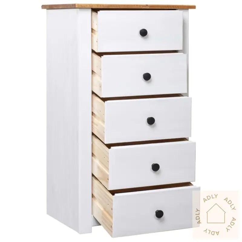 Kommoden Panama er laget av slitesterk og solid heltre furu, noe som gjør den til et tidløst valg blant møbler til hjemmet. Heltre furu gir et naturlig, varmende uttrykk – samtidig som materialet er robust og holder seg pent år etter år. Med hele 5 romslige skuffer får du god plass til å organisere klær, notater, elektronikk eller småting som lett blir liggende rundt i hverdagen. På toppen har du en romslig bordplate som passer perfekt til dekorative elementer som bilder, vaser eller potteplanter, så vel som til å lade mobilen.