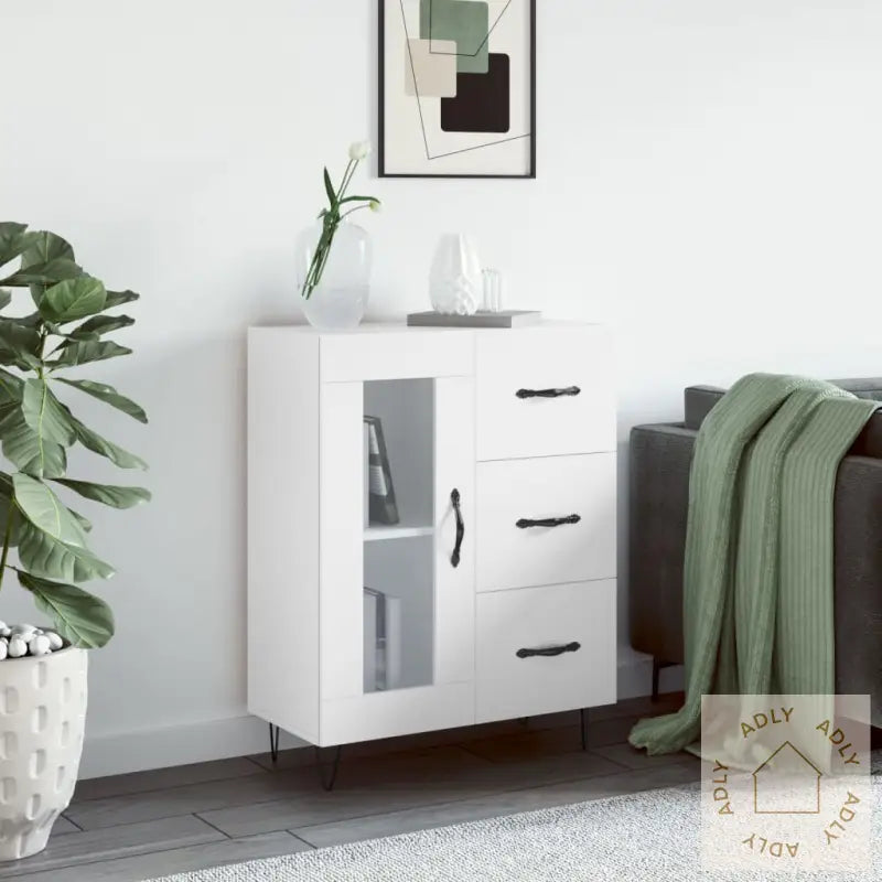 Solid materiale: Skjenken er laget av konstruert treverk med en glatt overflate, kjent for sin styrke, stabilitet, og evne til å motstå fuktighet – perfekt for langvarig bruk i hjemmet.Rikelig oppbevaring: Med sine 3 romslige skuffer kan du enkelt holde hverdagslige ting som nøkler, dokumenter og småting organisert. De 2 rommene bak glassdøren gir ekstra plass til alt fra servise til bøker, samtidig som du får lett oversikt og tilgang.Visningsfunksjon: På toppen av skjenken har du god plass til å sette ut pyntegjenstander, bilder eller grønne planter, slik at du får fremhevet din personlige stil i rommet.Praktisk dør: Hold eiendelene dine frie for støv og skjult bak dørene – det gir et ryddig og pent uttrykk i boligen.Metallføtter: De solide metallføttene gir et moderne løft og styrker både utseendet og stabiliteten til dette møbelet, så du får et sikkert, funksjonelt og stilig tilskudd sammen med de andre møblene dine.Enten du leter etter møbler til hjemmet eller ønsker å kombinere denne praktiske skjenken med hagemøbler og utendørsmøbler i hele hjemmet ditt, gir denne modellen deg ekstra verdi gjennom sin kvalitet og funksjonalitet.