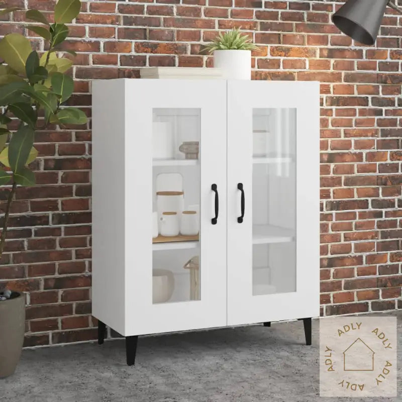 Solid materiale: Skapet er laget av konstruert treverk av høy kvalitet. Overflaten er glatt, og materialet er kjent for sin styrke, stabilitet og motstand mot fukt – noe som gir deg et varig møbel med minimalt vedlikehold.Rikelig med lagringsplass: Sideskapet har to romslige dører med god plass inni, så du enkelt kan holde orden på dine daglige ting eller andre nødvendigheter.Gjennomsiktige glassdører: De stilige, gjennomsiktige glassdørene gir deg mulighet til å vise frem favorittserviset, dekorasjoner eller samleobjekter. Glassdørene gir et elegant uttrykk, samtidig som du alltid har oversikt over inneholdet og finner det du trenger uten stress.Solid overflate: Skapets topp gir en stabil flate der du kan plassere alt fra pyntegjenstander, vaser til potteplanter – mye mer enn bare lagring!Merk: