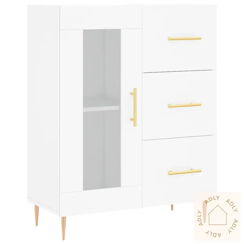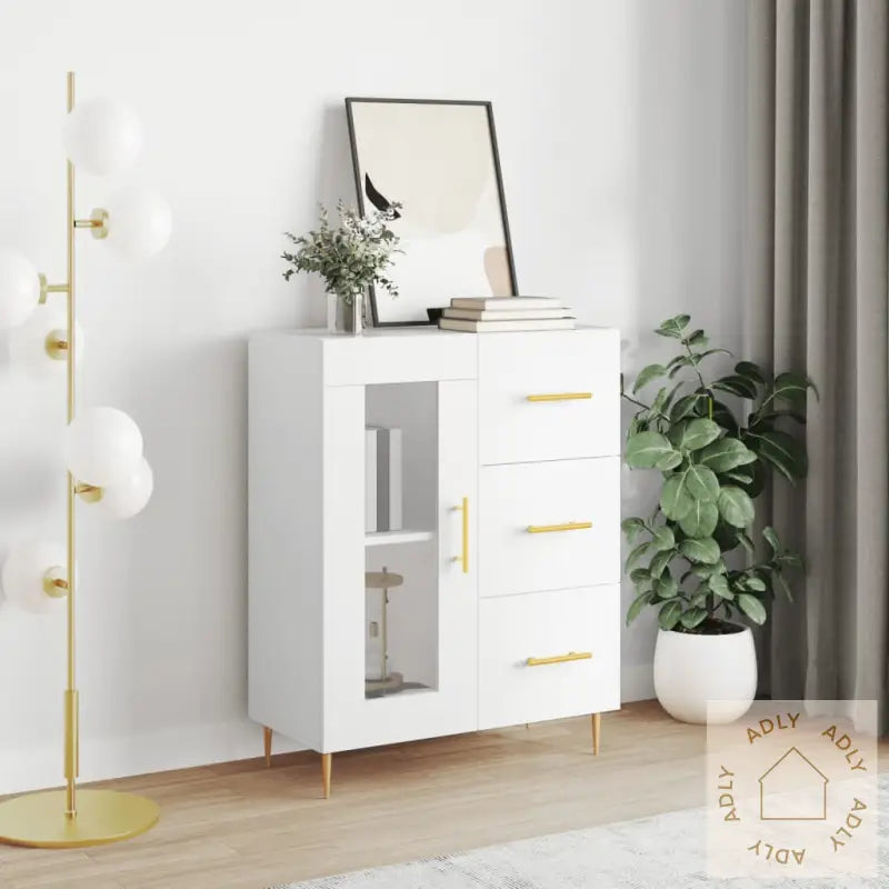Solid materiale: Det konstruerte treverket gir både god stabilitet og holdbarhet, samtidig som det tåler daglig bruk og er enkelt å rengjøre. Overflaten er glatt, noe som gjør at møbelet beholder sitt pene utseende over tid.Rikelig oppbevaring: Med tre praktiske skuffer og to rom bak en glassdør får du rikelig med lagringsplass til alt fra servise til pyntegjenstander, slik at du enkelt kan holde orden i boligen.Visningsfunksjon: Den robuste toppen av skjenken er ideell for å fremheve dekorasjoner, familiebilder eller potteplanter, og gir deg mulighet til å personliggjøre rommet ditt.Praktisk dør: Glassdøren holder tingene dine beskyttet mot støv og samtidig synlige, perfekt hvis du vil vise frem fine gjenstander eller samleobjekter.Metallføtter: Skjenken står solid på stilrene metallføtter som ikke bare gir ekstra stabilitet, men også tilfører en moderne touch til dine møbler til hjemmet.Advarsel: