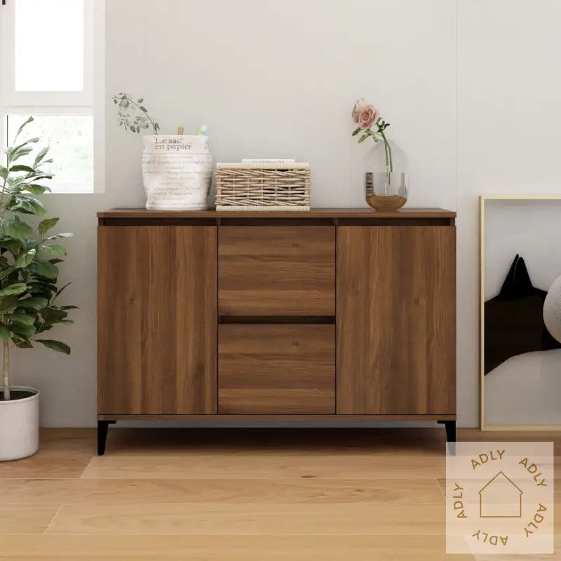 Skjenken byr på rikelig oppbevaringsplass slik at du enkelt kan organisere tingene dine. Med to skuffer og to dører får du god plass til alt fra servise til småting du ikke vil ha fremme.Bordplaten er solid og gir deg mange muligheter: Sett favorittbildene, planter eller dekorative gjenstander på toppen, eller bruk den som ekstra avlastningsbord – det gir hjemmet ditt et personlig preg. Skjenken er fleksibel og kan brukes som konsollbord, sideskap eller hva enn du har behov for.Skuffeskapet er laget av konstruert treverk med glatt overflate som er slitesterk, stabil og motstandsdyktig mot fuktighet. Dette gjør den både holdbar og lett å rengjøre, slik at du får glede av møbelet i mange år fremover.ADVARSEL: