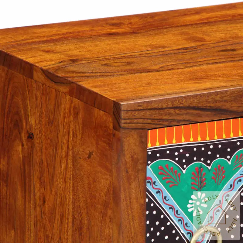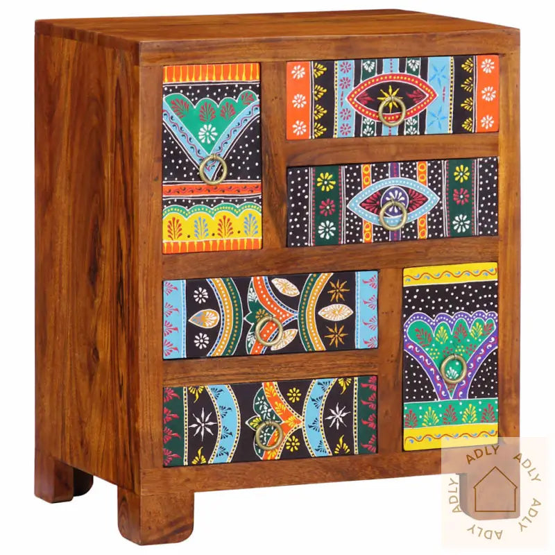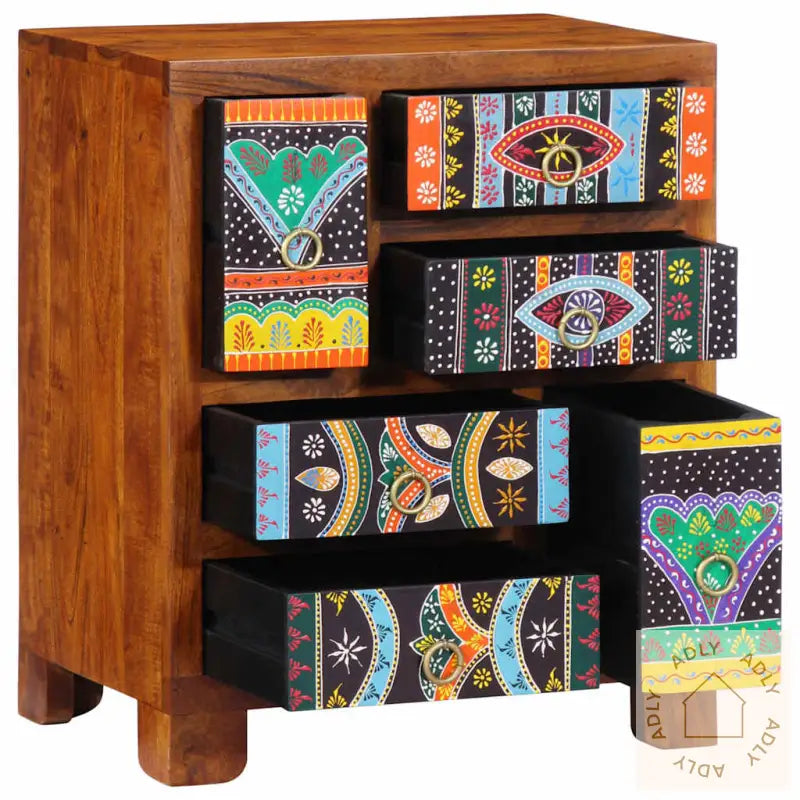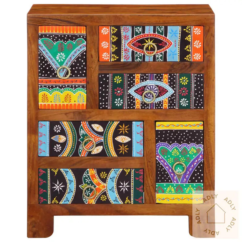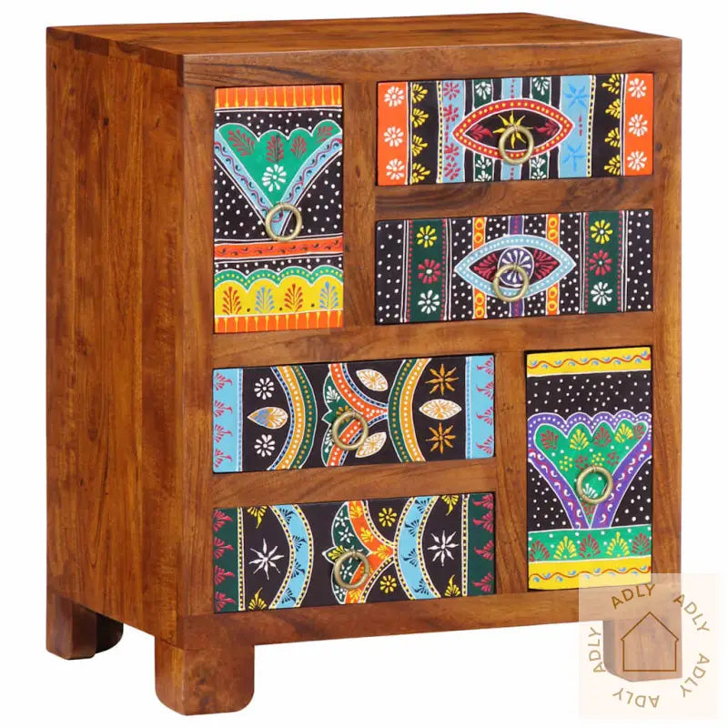 Robust og stabilt materiale: Heltre akasie er en favoritt når det gjelder møbler til hjemmet, særlig på grunn av materialets styrke og holdbarhet. Skjenken har et unikt utseende takket være de naturlige fargevariasjonene og flotte kornmønstrene i treverket. Dette gir hver eneste skjenk sitt eget særpreg. Akasie egner seg ekstra godt for deg som ser etter solide innemøbler eller holdbare utendørsmøbler og hagemøbler.Rikelig med oppbevaringsplass: Med hele 6 skuffer har du all plassen du trenger til å lagre alt fra servise og bordtekstiler til andre nødvendigheter. Skuffene hjelper deg å holde orden og gir rask tilgang til tingene dine.Levende skjønnhet: Sidepanelet er utsmykket med håndmalte detaljer i sterke, livlige farger. Dette gjør skjenken til et ekte blikkfang og gir et personlig, kunstnerisk preg som passer perfekt sammen med mange ulike stilarter i hjemmet.Brede bruksområder: Takket være det allsidige designet fungerer dette skapet like godt som baderomsskap, kjøkkenskap, eller bare et smart og estetisk oppbevaringsskap i stue, gang, soverom, på kontoret eller andre rom. Dette gjør det enkelt å flytte rundt og bruke etter behov.Godt å vite:
