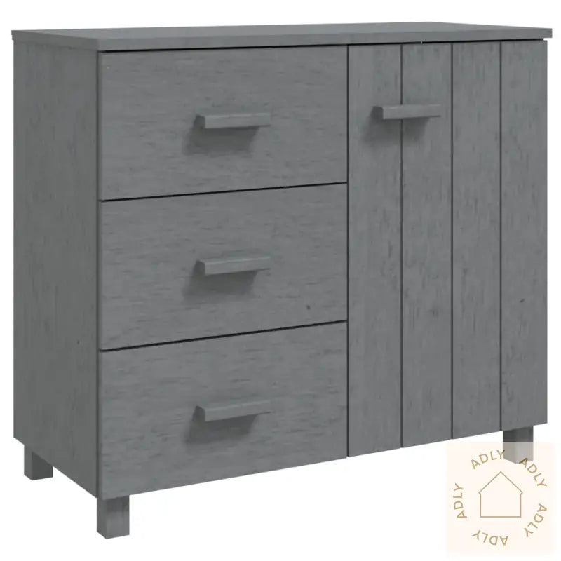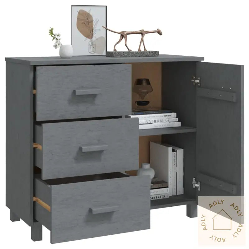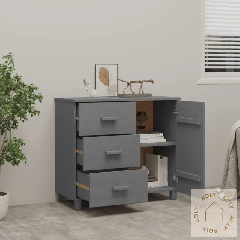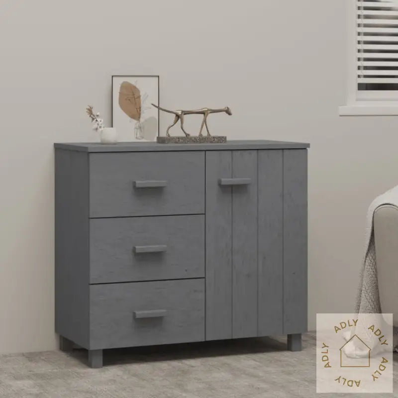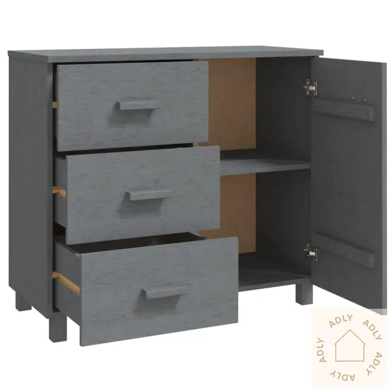 Farge: mørkegråMaterialer: heltre furu, MDFSamlet mål: 90 x 40 x 80 cm (B x D x H)Ytre mål skuff: 45 x 23 cm (B x H)Indre mål skuff: 37 x 33,5 x 18 cm (B x D x H)Mål dør: 43 x 70 cm (B x H)Mål hylle: 40 x 37 x 30 cm (B x D x H)Med trehåndtakUtvalg: HAMARMontering kreves: jaAdvarsel: For å unngå at møbelet velter, må de medfølgende festene for vegg brukes.