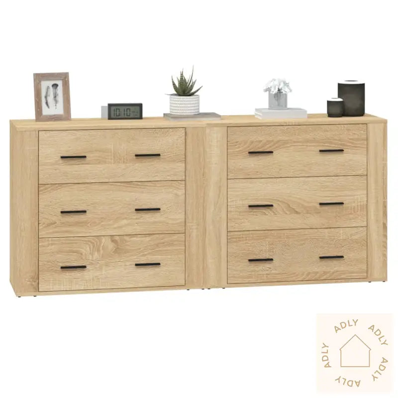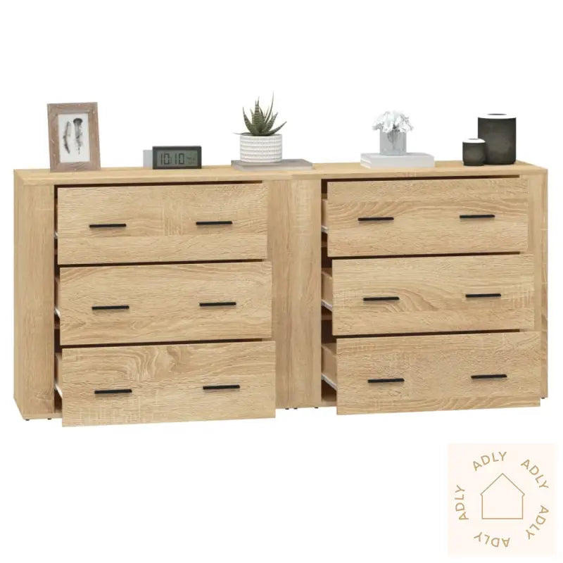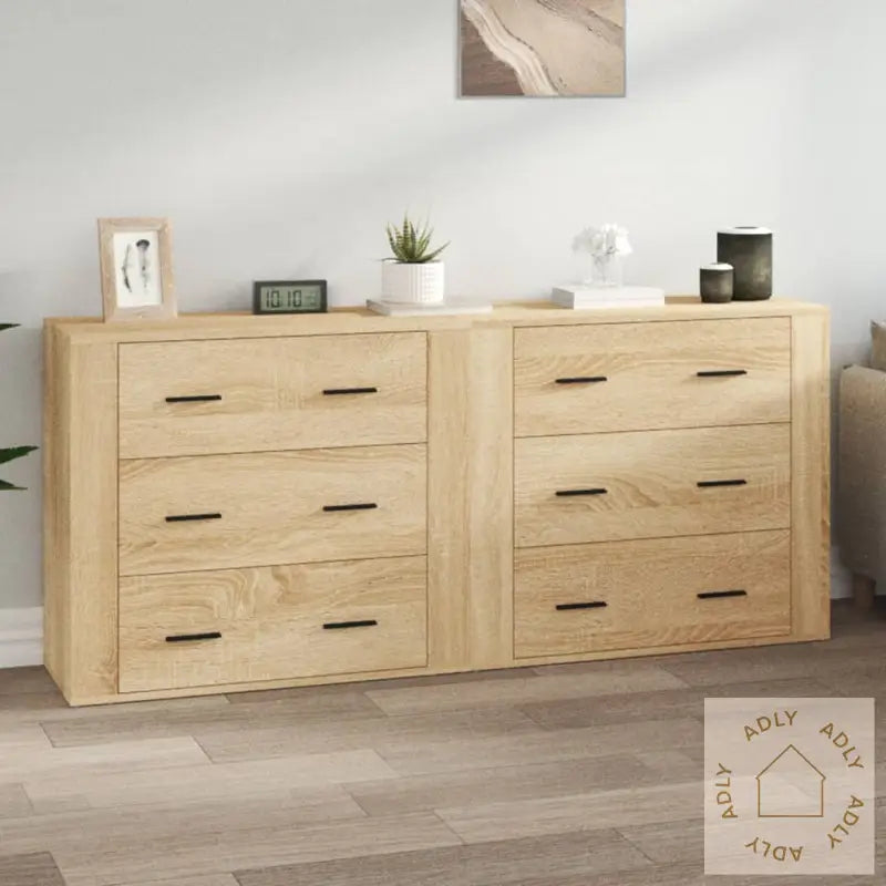 Slitesterkt materiale: Skjenkene er laget av konstruert tre av høy kvalitet med en jevn overflate. Dette gir ikke bare styrke og stabilitet, men sørger også for lang levetid og ekstra motstand mot fuktighet – perfekt i nordiske hjem eller der det stilles krav til hagemøbler eller møbler som tåler litt ekstra.Rikelig lagringsplass: Skapene er romslige og gir deg god plass til å oppbevare alt fra servise og kjøkkentilbehør til bøker og elektronikk. Du får enkelt organisert daglige nødvendigheter og holder dem tilgjengelige akkurat der du trenger dem.Utstillingsfunksjon: Skjenkenes solide topp er perfekt til å vise frem favorittbilder, dekorative elementer, planter eller blomster. Dette gir deg muligheten til å gjøre interiøret mer personlig og sette et hyggelig preg på rommet.Godt å vite: