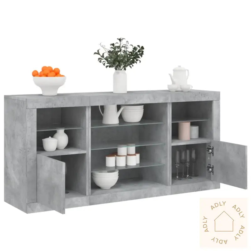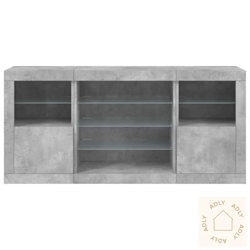 For sikker bruk anbefales det at skjenken sikres med den medfølgende festeanordningen for å forhindre velt.Farge: Betonggrå for et moderne og tidløst uttrykk.Materialer: Konstruert tre og glass sikrer holdbarhet og gir et elegant utseende.Samlet mål: 142,5 x 37 x 67 cm (L x B x H) – romslig uten å ta for mye gulvplass.Montering kreves: Ja, men prosessen er enkel, slik at du raskt kan få på plass din nye skjenk.Leveransen inneholder:2 x skjenker: 41 x 37 x 67 cm (L x B x H)1 x skjenk: 60,5 x 37 x 67 cm (L x B x H)Legal Documents: