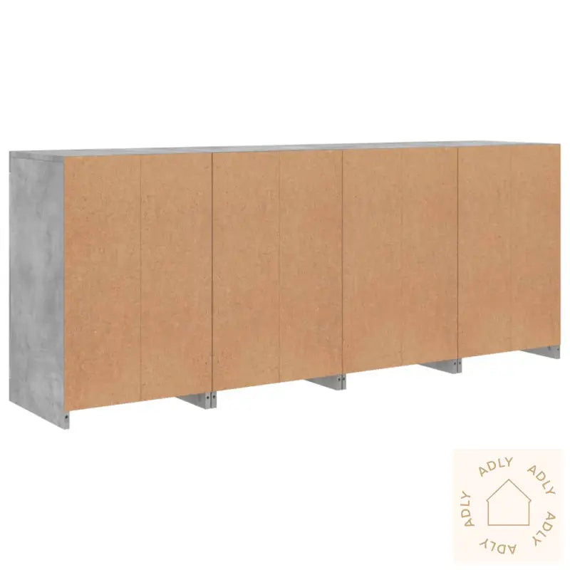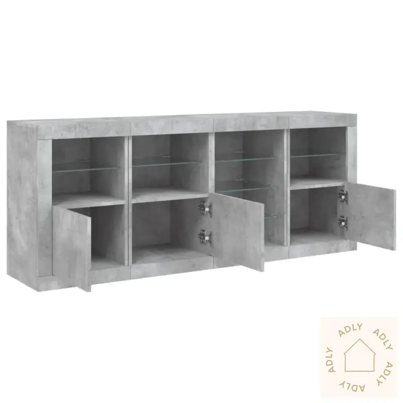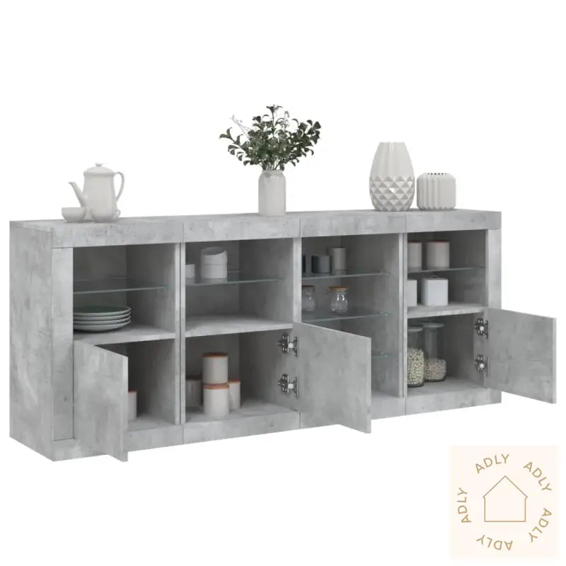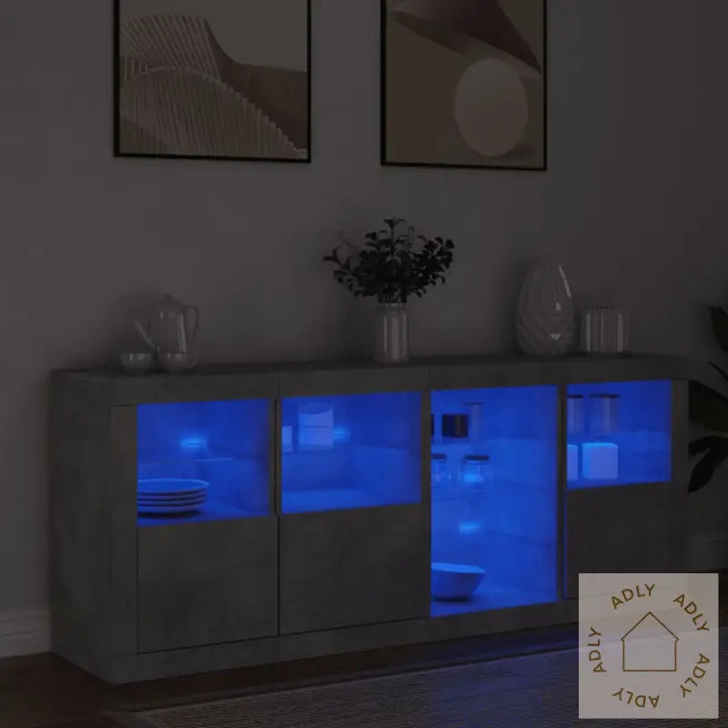 Det slitesterke konstruerte treverket har en glatt finish som gir både styrke, stabilitet og god motstand mot fukt. Dette gjør at skjenken holder seg pen over tid – perfekt for både stue og gang.RGB LED-lys gir deg mange muligheter til å tilpasse lyssettingen etter humør eller anledning. Du kan velge mellom flere farger eller automatiske skiftende lys, noe som gjør det enkelt å sette stemningen og fremheve det stilrene designet. Lysene gir skjenken et ekstra moderne preg, og fungerer som et kult blikkfang i interiøret.Du får rikelig med oppbevaringsplass, slik at du kan holde både småting og nødvendigheter organisert og lett tilgjengelig. Det smarte oppbevaringssystemet gjør dette til en funksjonell del av dine møbler til hjemmet, og ikke bare et dekorativt element.Den solide toppen har god plass til å stille ut favorittdekor, bilder eller grønne planter, noe som gir deg mulighet til å personliggjøre uttrykket og gjøre rommet hjemmehyggelig.Skjenken har praktiske dører som beskytter tingene dine mot støv. Alt holdes skjult og ryddig, noe som gir et rent og elegant inntrykk i alle rom.Godt å vite: