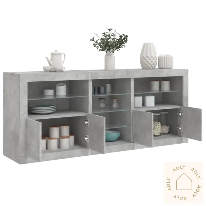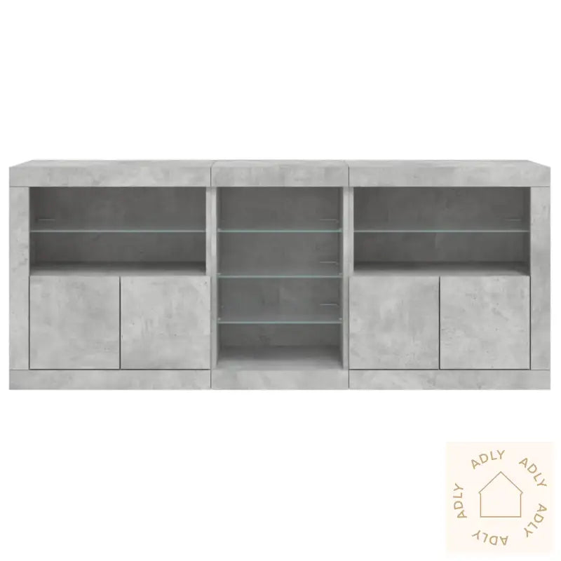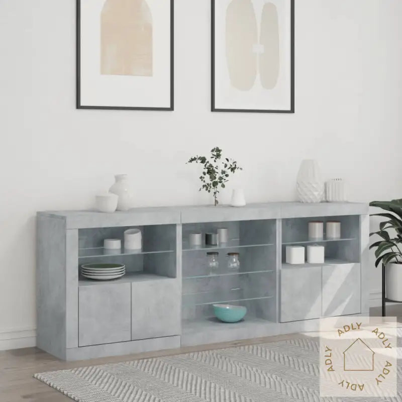 For å sikre trygg bruk og unngå at møblet velter bør festeanordningen som følger med brukes.Farge: BetonggråMaterialer: Konstruert tre, glassSamlet størrelse: 181,5 x 37 x 67 cm (B x D x H)Krever monteringLeveransen inkluderer:3 x skjenker, hver 60,5 x 37 x 67 cm (B x D x H)Legal Documents: