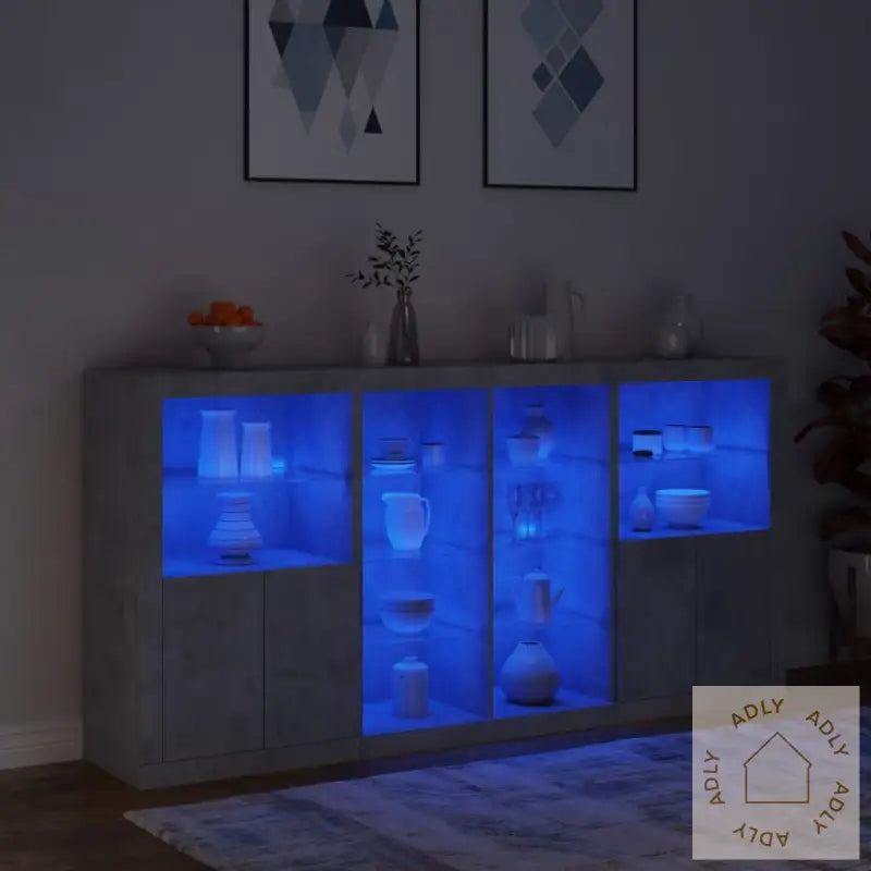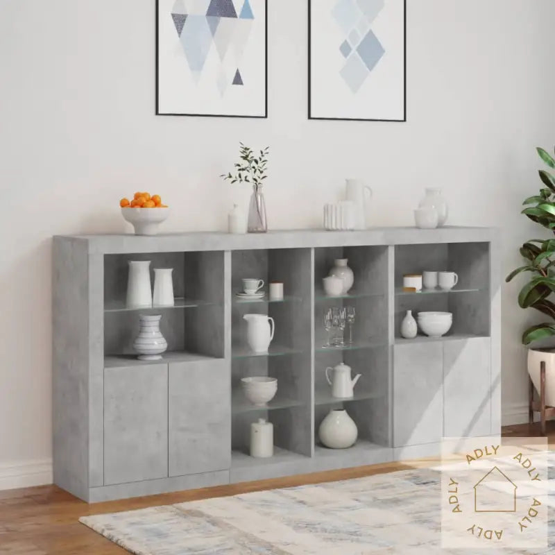 Slitesterkt materiale: Skjenken er laget av konstruert tre av høy kvalitet, noe som gir en jevn og robust overflate. Materialet gir styrke og stabilitet, samtidig som det tåler fuktighet godt, perfekt for daglig bruk.RGB LED-lys: Den stilige buffeen leveres med integrerte og livlige RGB LED-lys. Du kan enkelt endre farger og lysinnstillinger etter humør eller anledning via de ulike tilpasningsmenyene. Med automatisk justering skaper du en personlig atmosfære – alt for å booste den trendy og moderne effekten i rommet ditt. Disse rgb led-lysene tilfører noe ekstra til møbelet og blir raskt et stilig blikkfang.Rikelig med oppbevaringsplass: Skapet byr på masse plass til å holde alt fra bøker til dekorasjon og hverdagsting lett tilgjengelig og ryddig organisert.Visningsfunksjon: Bruk den solide toppen av skjenken til å vise frem pyntegjenstander, dine beste bilder eller noen grønne planter for å sette ditt personlige preg.Praktiske dører: Sideskapenes dører gjør at du enkelt kan gjemme bort ting du ikke vil ha fremme, så de holder seg støvfri og pene uten at du må rydde hele tiden.Godt å vite: