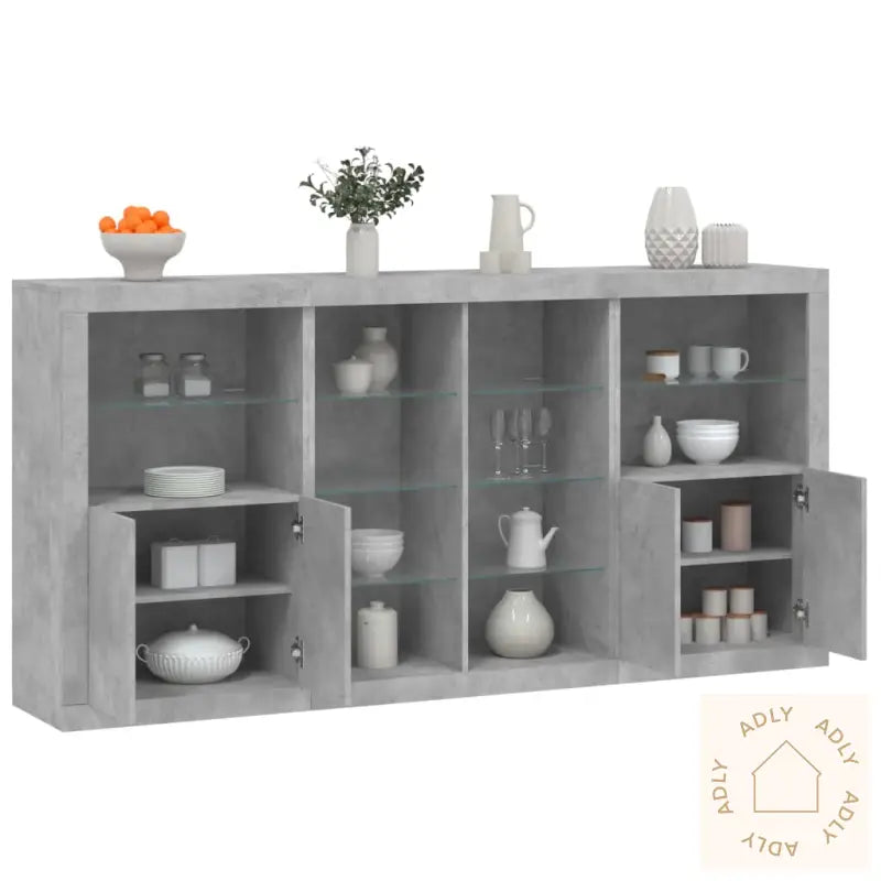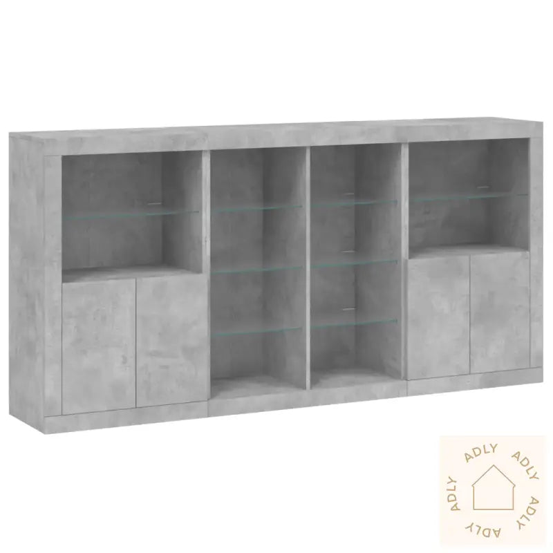 For trygg bruk og for å unngå at skjenken velter, bør den alltid festes forsvarlig til veggen med den medfølgende sikringen.Farge: betonggrå, en fresh og moderne nyanse som matcher forskjellige typer møbler til hjemmet.Materialer: konstruert tre og glass – en kombinasjon som gir både design og slitestyrke.Samlet mål: 202 x 37 x 100 cm (B x D x H).Montering kreves: ja, men bruksanvisningen er enkel å følge.Leveransen inneholder:2 x skjenk: 60,5 x 37 x 100 cm (B x D x H)1 x skjenk: 81 x 37 x 100 cm (B x D x H)Legal Documents: