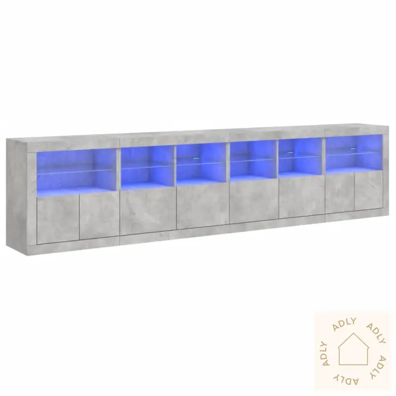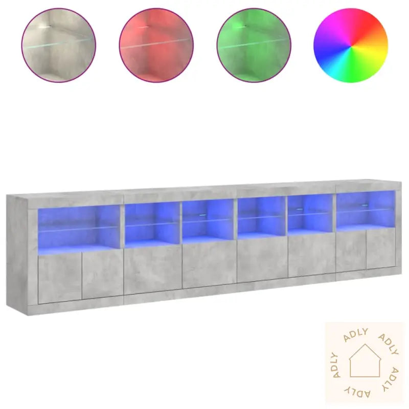 Slitesterkt materiale: Denne skjenken består av konstruert treverk som er kjent for ekstra lang holdbarhet og sitter stødig på plass. Overflaten føles glatt og raffinert, samtidig som den beskytter mot fukt. Det gir deg pålitelig styrke og stabilitet over tid.RGB LED-lys: Buffeen kommer med dynamiske RGB LED-lys, som lar deg tilpasse stemningen for enhver anledning. Bruk de forskjellige menyene for å skifte mellom farger eller aktiver automatisk justering for et levende preg i hverdagen. Lysene fremhever den trendy designen og gir skjenken et eksklusivt uttrykk, helt i tråd med dagens trender innen møbler til hjemmet.Rikelig med oppbevaringsplass: Du får rause skap og hyller, så du enkelt kan organisere alt fra servise til småfavoritter eller elektronikk. Hverdagsgjenstander blir liggende systematisk og er alltid lett tilgjengelige, noe som gjør dette til en praktisk løsning for ethvert rom.Visningsfunksjon: Inviter til personlig stil med en solid topp der du kan vise frem dekorative elementer, bilder eller grønne planter. Skap ditt eget uttrykk og bytt ut pynten etter sesong eller anledning.Praktiske dører: Hold alt støvfritt og ryddig ved å skjule det bak elegante dører. Perfekt om du vil ha et minimalistisk og rent interiør, eller bare sette bort ting du bruker sjeldnere.Godt å vite: