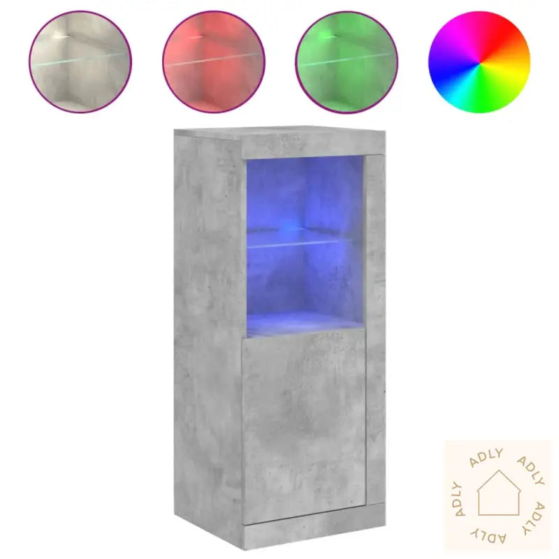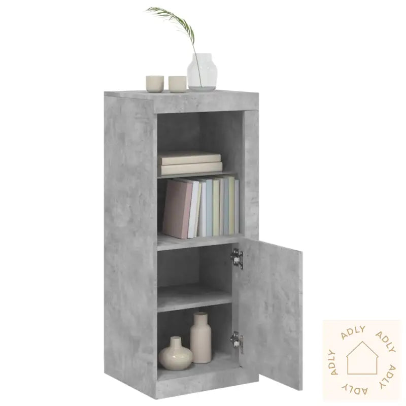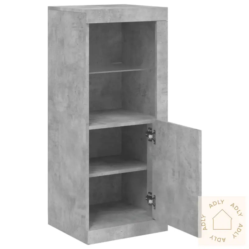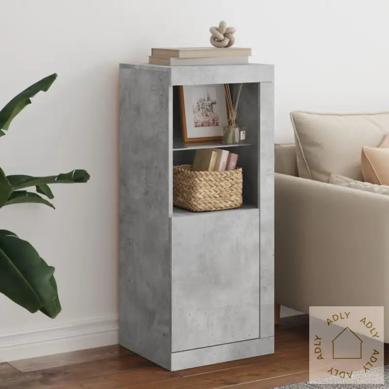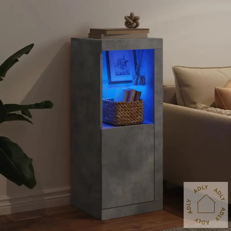 Skapet har USB-kontakt og krever en sertifisert 5V USB-strømkilde (strømkilde medfølger ikke).Farge: betonggråMaterialer: konstruert tre, glassMål: 41 x 37 x 100 cm (B x D x H)Montering kreves: jaLegal Documents: