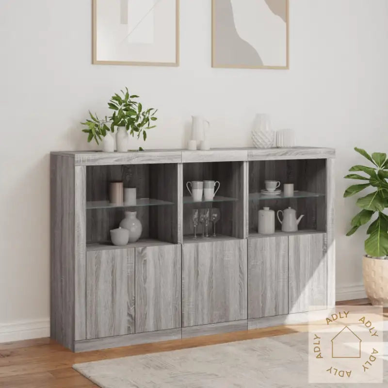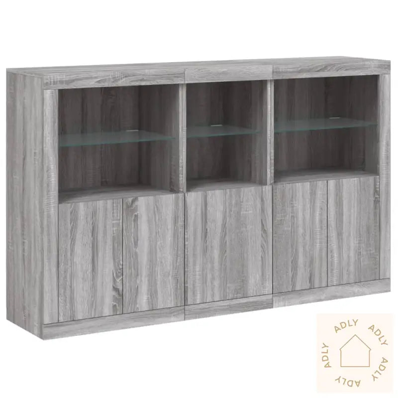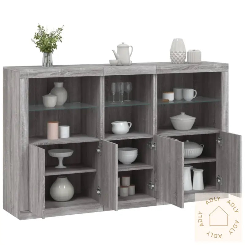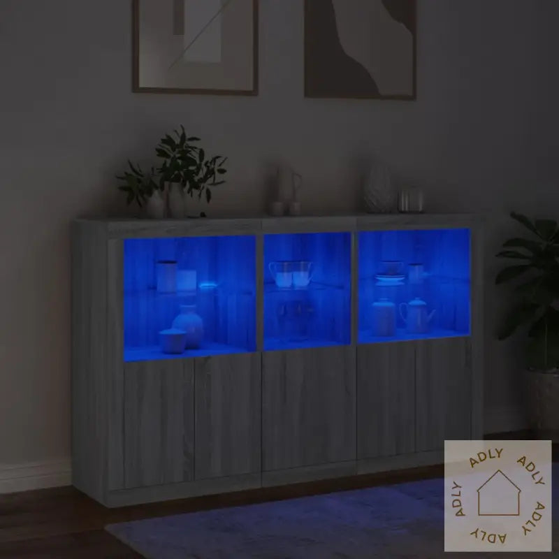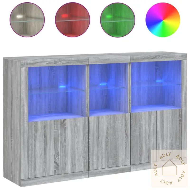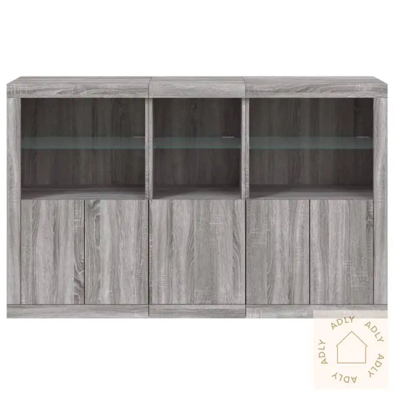 Slitesterkt materiale: Skjenken er laget av konstruert tre med høy kvalitet, noe som gir en glatt overflate og sørger for styrke og stabilitet. Materialet motstår også fuktighet, så det holder seg pent over tid selv i rom hvor luftfuktigheten varierer.RGB LED-lys: Buffeen leveres med innebygde RGB LED-lys som kan justeres etter humør og behov. Du kan velge blant mange ulike farger og moduser via de tilpassbare menyene. Enten du ønsker et rolig lys til kvelden eller festlys til sammenkomster, gir dette ekstra funksjonalitet og en unik stemning som fremhever det moderne preget og gjør skjenken til et blikkfang blant dine andre møbler.Rikelig med oppbevaringsplass: Det store oppbevaringsskapet gir deg rikelig med plass til alt du vil ha lett tilgjengelig i hverdagen, fra servise og bestikk til mapper og gadgets. Alt holdes organisert og på sin plass, så du slipper rot.Visningsfunksjon: Den solide toppen gir god plass til å vise frem dekor, som fotorammer, potteplanter eller favorittbøkene dine. Kombiner den gjerne med bokhyller og stående hyller i samme stil for et helhetlig uttrykk.Praktiske dører: Sideskapets dører beskytter innholdet mot støv og bidrar til et ryddig uttrykk ved at alle tingene dine kan skjules bak lukkede dører.Godt å vite: