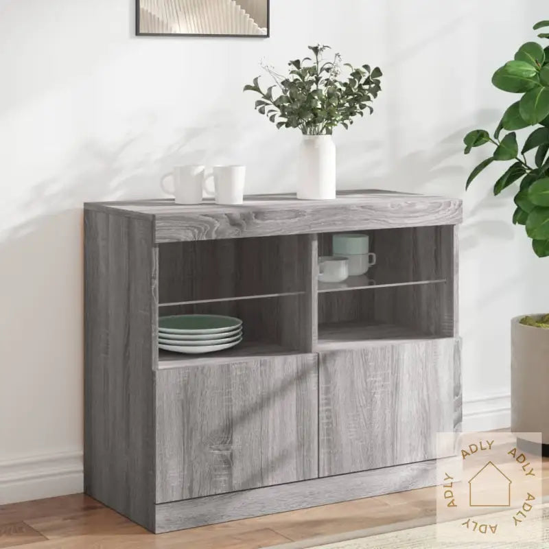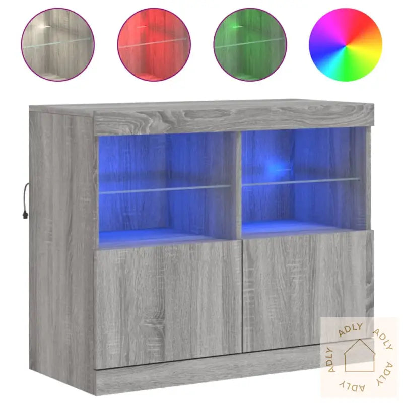 Skap laget av slitesterkt konstruert treverk, kjent for sin glatte overflate og evne til å stå imot både fukt og daglig bruk. Materialet gir deg både styrke og stabilitet slik at skjenken holder seg fin over tid.Med god lagringsplass sørger denne buffeen for at magasiner, bøker, fjernkontroller og andre småting kan organiseres og holdes lett tilgjengelig. Perfekt for deg som ønsker orden på rommet uten at det går på bekostning av stilen.Den solide bordplaten i skjenken gir deg mulighet til å vise frem favorittdekorasjoner, bilder eller potteplanter. Du kan også bruke den som base for personlige utrykk og sesongdekorasjoner.RGB LED-lysene gir deg spennende muligheter for å skape akkurat den stemningen du vil ha. Velg mellom ulike farger eller sett lyset til automatisk endring. Med de fargerike LED-lysene blir dette møbelet en dekorativ detalj i hjemmet, enten det er i TV-stuen, på soverommet eller i gangen.Advarsel: