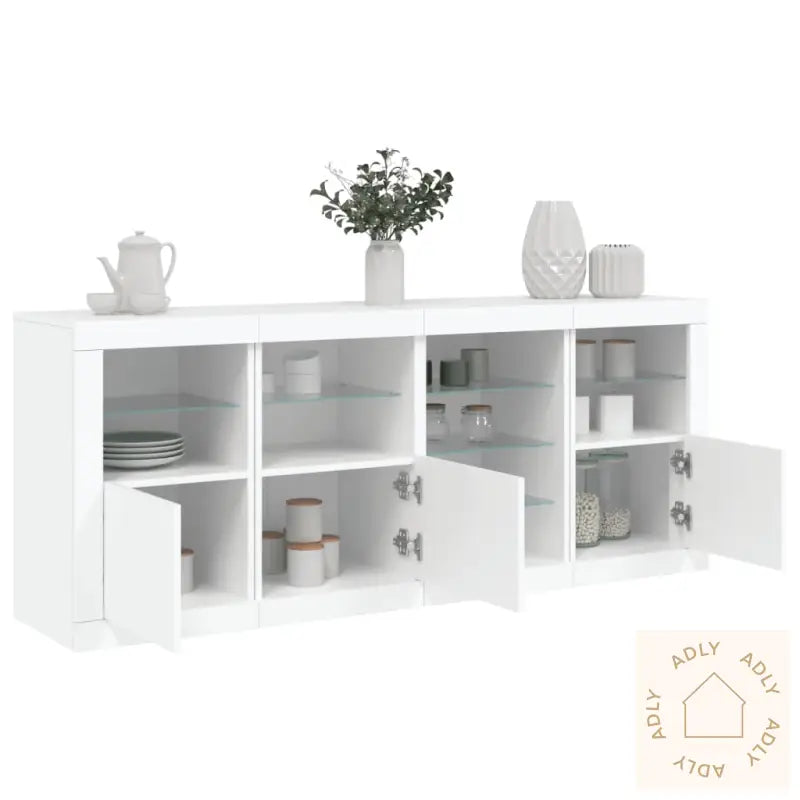 Skjenken er laget av slitesterkt konstruert treverk, som gir overlegen kvalitet og en jevn, elegant overflate. Dette materialet gir ekstra styrke, stabilitet og god motstand mot fukt, slik at du får et langvarig og robust møbel i hjemmet ditt.Med levende RGB LED-lys kan du skape akkurat den stemningen du ønsker. Velg mellom mange farger, eller sett lysene til å endres automatisk via det tilpassbare menyvalget. Disse lysene gir buffeen et moderne preg og gjør skjenken ekstra trendy – perfekt om du vil ha noe litt annerledes blant dine møbler til hjemmet.Oppbevaringsskapet tilbyr rikelig med plass til å holde orden i hverdagen. Lagre alt fra servise til bøker, spill eller småting, og ha dem alltid innen rekkevidde.Den solide overflaten på toppen gir en flott plass til å vise frem dekor, som favorittbilder, vaser eller grønne planter.Praktiske dører beskytter tingene dine mot støv, og gir samtidig et ryddig uttrykk. Skjul både nødvendigheter og personlige eiendeler enkelt bak dørene, så rommet får et rent og organisert utseende.Godt å vite: