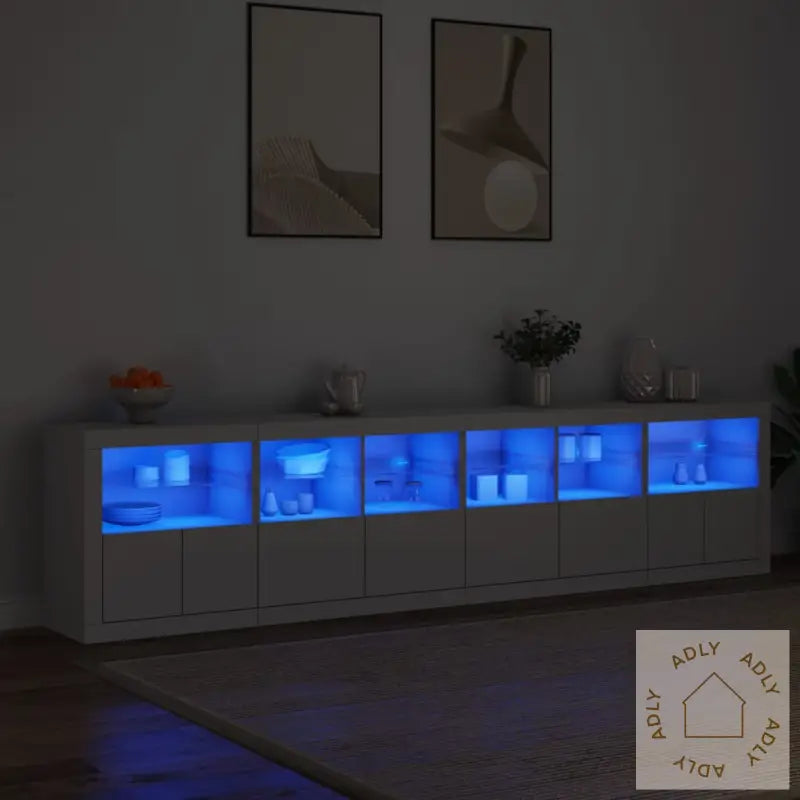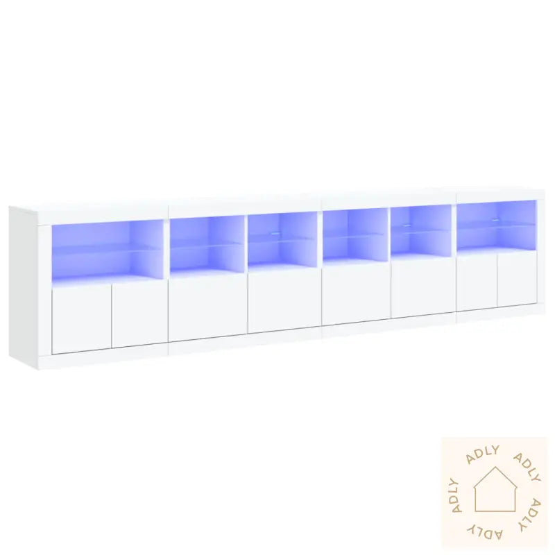 Slitesterkt materiale: Skjenken er laget av konstruert treverk av høy kvalitet, noe som gir en glatt finish samt styrke og stabilitet. Den solide konstruksjonen tåler daglig bruk og er også motstandsdyktig mot fuktighet – perfekt for travle hjem eller som en del av funksjonelle møbler i ulike rom.RGB LED-lys: Møbelet har innebygd RGB LED-lys med imponerende funksjoner. Du kan enkelt tilpasse fargeinnstillingene etter humør eller behov, og stole på automatisk justering for ekstra effekt. Dette gir ikke bare en kul kontrast til det hvite treverket og glasset, men setter prikken over i-en for deg som elsker moderne detaljer og unike hagemøbler eller interiør med ekstra wow-faktor.Rikelig med oppbevaringsplass: Med smarte rom og god plass får du et oppbevaringsskap der det er lett å organisere alt fra servise og glass til bøker, pynt eller personlige eiendeler. Alt er ryddig lagret og enkelt tilgjengelig når du trenger det.Visningsfunksjon: Den robuste toppen gir perfekt plass til å fremheve favorittdekorasjonene dine – enten det er fotoalbum, lysestaker eller grønne planter. Ta interiøret til neste nivå med utvalgte pynteting som matcher din stil.Praktiske dører: Hold tingene dine rene og støvfrie ved å plassere dem bak de solide dørene – genialt for alt du bruker mye, men ikke alltid ønsker å ha framme, samtidig som rommet føles ryddig og innbydende.Godt å vite: