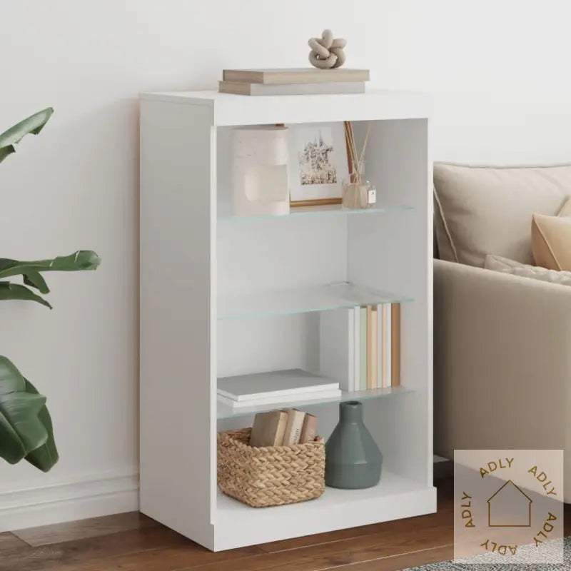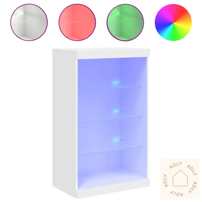 Slitesterkt materiale: Skjenken er laget av konstruert treverk med høy kvalitet, og gir en glatt overflate som både ser bra ut og tåler daglig bruk. Materialet sørger for styrke, stabilitet og beskytter mot fukt, slik at du får langvarig glede av møbelet.Rikelig med lagringsplass: Denne moderne buffeen tilbyr masse oppbevaringsplass hvor du enkelt kan samle og holde orden på magasiner, bøker, fjernkontroller eller andre småting, slik at stuen eller andre rom føles ryddige og oversiktlige.Visningsmuligheter: Den solide toppen i glass eller tre gir perfekt plass til å vise frem dekorative elementer, flotte bilder eller grønne potteplanter. Dette gjør skjenken til et naturlig samlingspunkt blant dine øvrige bokhyller og stående hyller.Justerbare LED-lys: Med innebygde RGB LED-lys kan du bytte mellom ulike farger, så du alltid får den stemningen du vil ha i rommet. Lysene styres via menyen og lar deg enkelt dekorere hjemmet med levende farger for et personlig preg.Advarsel: