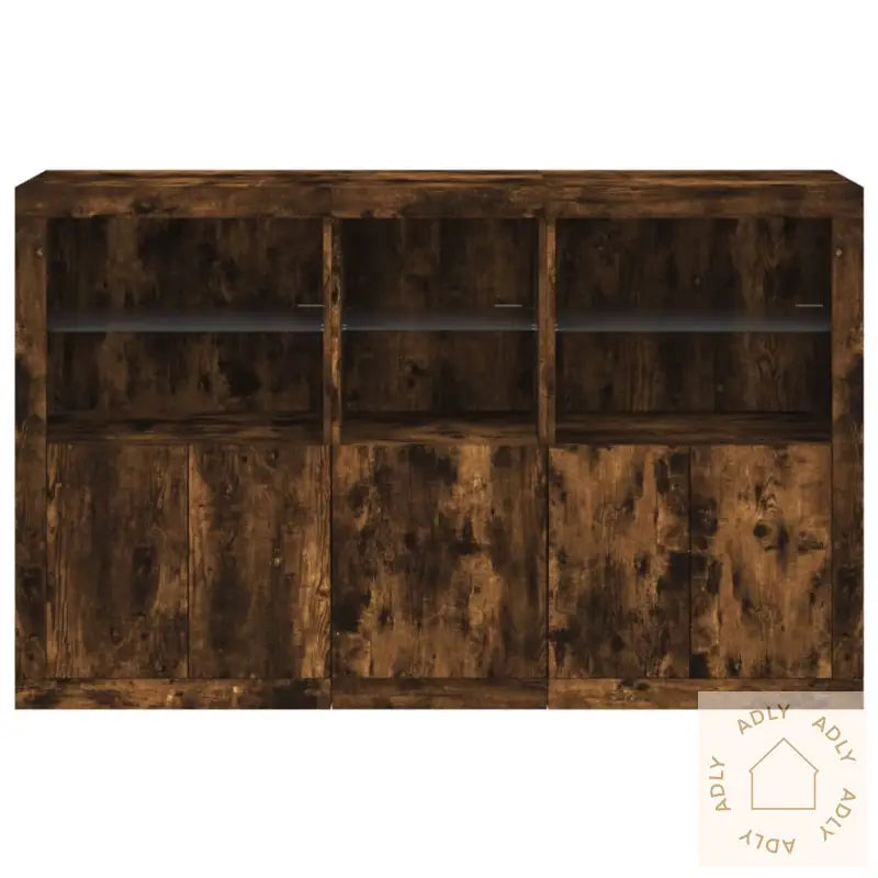Slitesterkt materiale: Denne skjenken er laget av førsteklasses konstruert treverk, kjent for sin jevne finish, styrke og stabilitet. Materialet tåler daglig bruk og har god motstand mot fuktighet, så det holder seg pent lenge.RGB LED-lys: Buffeen har integrerte, livlige RGB LED-lys som lar deg tilpasse atmosfæren etter humør eller anledning. Velg blant flere farger eller bruk den automatiske funksjonen for enda mer variasjon. LED-lysene gir et moderne og spennende preg, perfekt for deg som vil ha trendy møbler til hjemmet ditt.Rikelig oppbevaringsplass: Med praktiske skap og hyller har du stor plass til å holde dagligdagse ting, pynt eller elektronikk systematisk og lett tilgjengelig.Stilfull visningsflate: Øverst på denne skjenken får du en solid overflate hvor favorittdekor som bilder, grønne planter eller lysestaker kan plasseres for ekstra personlig touch.Praktiske dører: Skjenkens dører sørger for at alt du ønsker å skjule fra støv og nysgjerrige øyne ligger trygt bak solide fronter, samtidig som helhetsinntrykket bevares ryddig.Godt å vite: