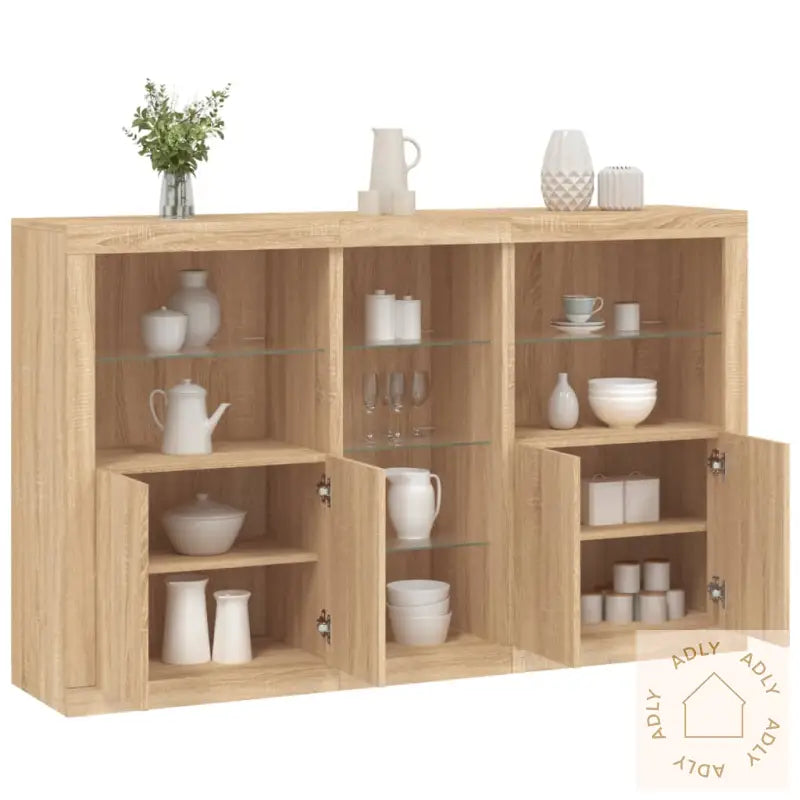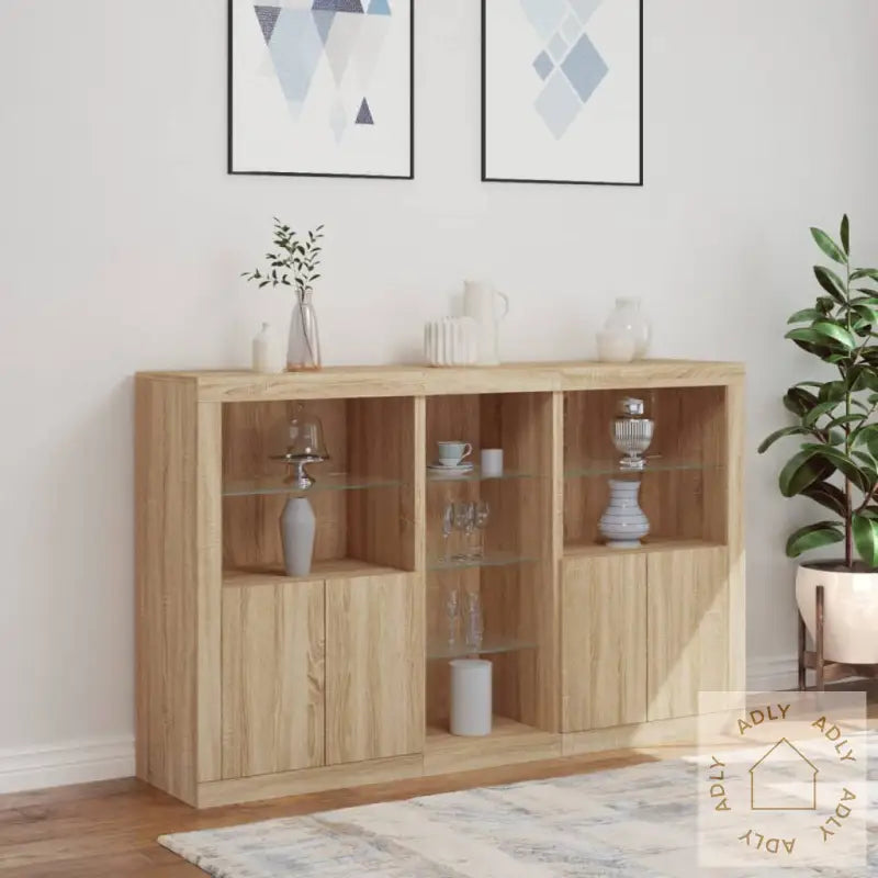 Dekorer rommet ditt med denne moderne skjenken i sonoma eik, komplett med RGB LED-lys for en ekstra touch av stil og atmosfære. Med sitt tidløse design og nøytrale fargetoner matcher denne skjenken enkelt med alle typer møbler til hjemmet, enten du har klassisk eller moderne innredning.
