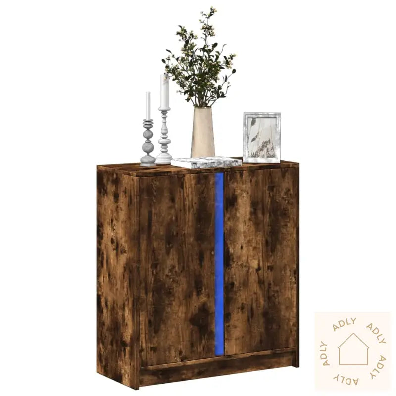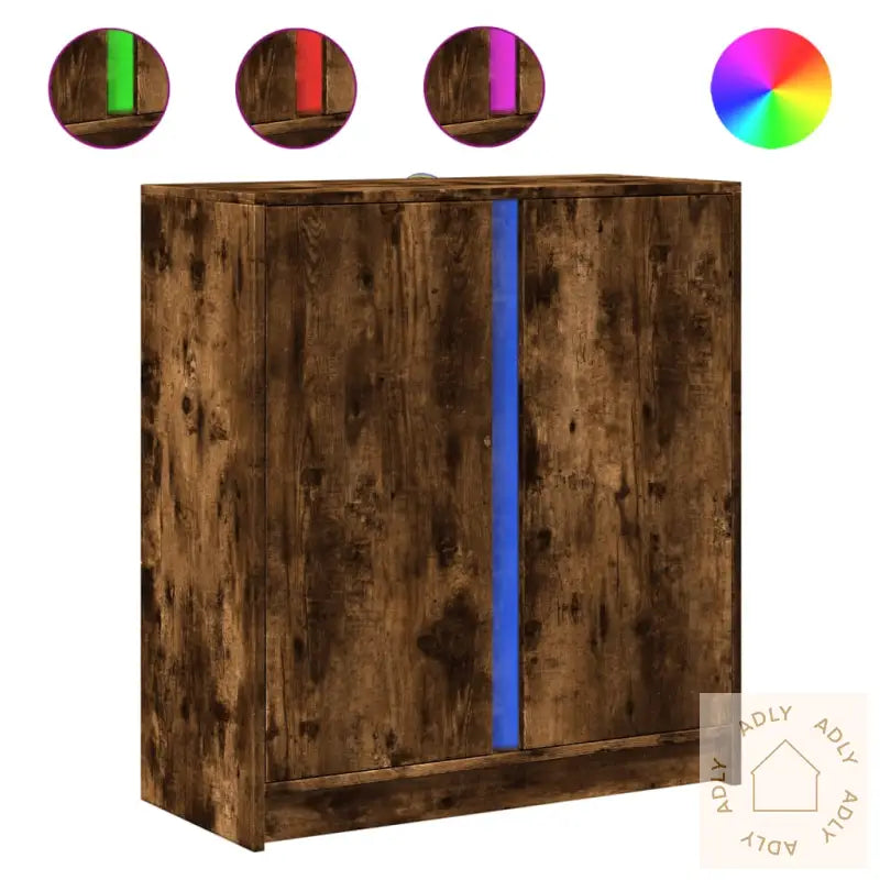 Den er laget av konstruert treverk av høy kvalitet, kjent for sin glatte overflate, styrke, gode stabilitet og evnen til å tåle fuktighet – noe som gjør den til et robust valg for hjemmet ditt.RGB LED-lysene kan endre farge etter humøret ditt eller anledningen. Du kan velge flere forskjellige farger og lysmoduser via en brukervennlig meny. Enten du vil skape en koselig stemning, fremheve dekorasjoner, eller ha litt ekstra wow-effekt når du får besøk, gir LED-belysningen denne buffeen en ekstra moderne og trendy detalj.Med godt med oppbevaringsplass inni skapet, får du plass til å holde orden på tingene dine – alt fra servise og glass til hverdagslige småsaker har sin plass, så hjemmet føles både ryddig og gjennomført.Den solide toppen gjør det enkelt å vise frem favoritter som bilder, fine vaser eller potteplanter, og gir samtidig et personlig preg på rommet.Praktiske dører skjuler tingene dine og beskytter dem mot støv, så innholdet holder seg pent lenger.Godt å vite: