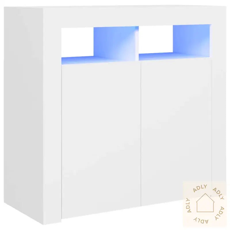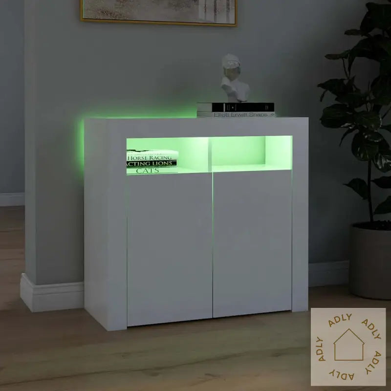 Skapet er laget av slitesterkt konstruert treverk, noe som gir en glatt overflate, solid styrke, og gjør det motstandsdyktig mot fuktighet. Dette betyr at skjenken holder seg pen lenge, selv ved daglig bruk.Med integrerte RGB LED-lys får du dynamisk belysning som enkelt kan tilpasses etter humøret eller anledningen. Du kan velge mellom ulike farger og innstillinger fra en meny, og til og med stille lysene til automatisk skiftende effekter. Det gir ikke bare et stilig utseende, men skaper også en hyggelig stemning i rommet – ytmerket når du ønsker å imponere gjestene eller gjøre hverdagen litt mer inspirerende.Du får rikelig med plass til oppbevaring, slik at ting som bøker, elektronikk, servise eller annet du ofte bruker enkelt holdes organisert og lett tilgjengelig.Den robuste toppflaten på denne skjenken passer perfekt til å vise frem favorittdekor, bilder eller grønne planter, slik at du kan sette ditt personlige preg på interiøret.De praktiske dørene holder eiendelene dine beskyttet mot støv, og gir et ryddig uttrykk uten synlig rot.Godt å vite: