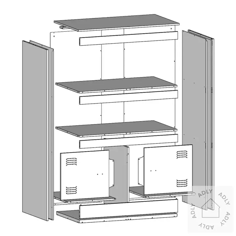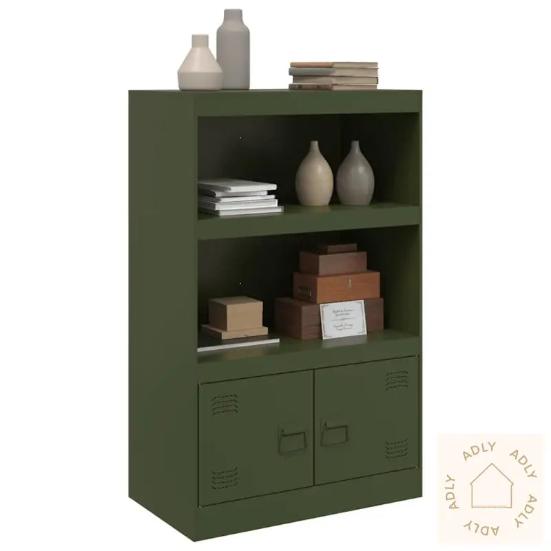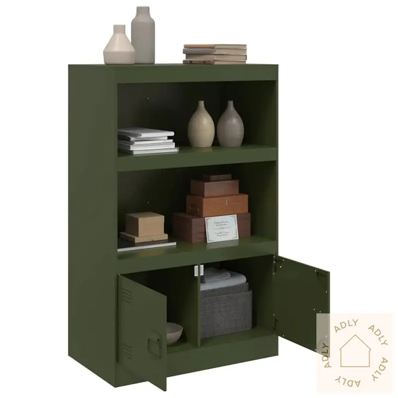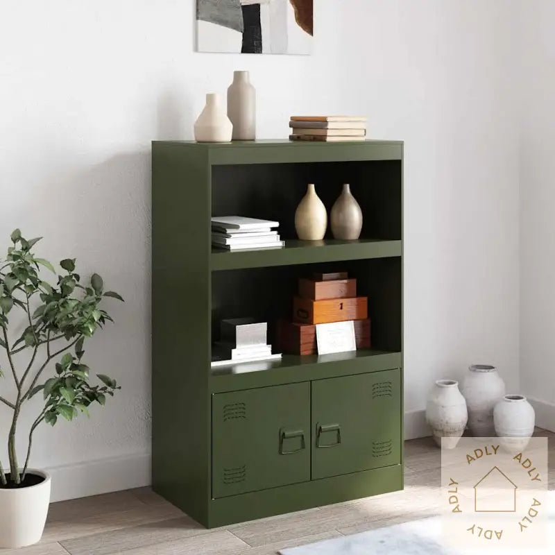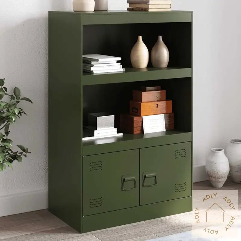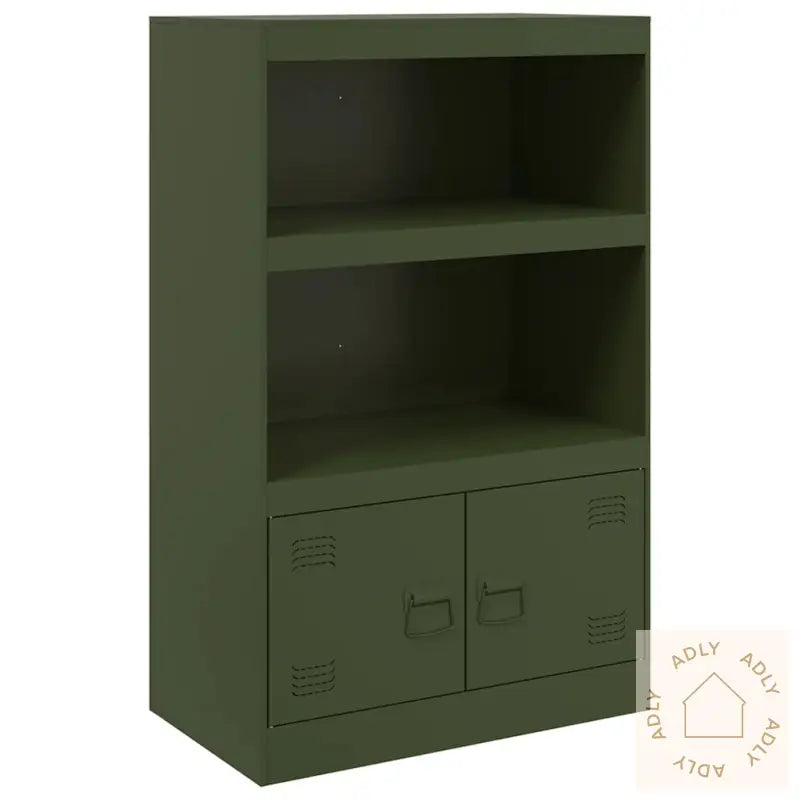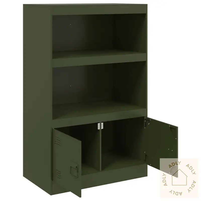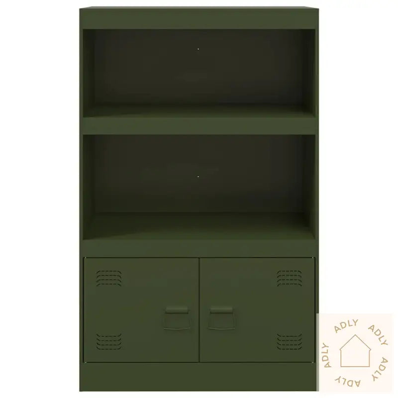 Farge: olivengrønnMateriale: kaldvalset stålMål: 67 x 35 x 107 cm (B x D x H)Maksimal lastekapasitet: 90 kgMed 2 hyller2 rom med dørerMed 2 metallhåndtakMontering kreves: jaLegal Documents: