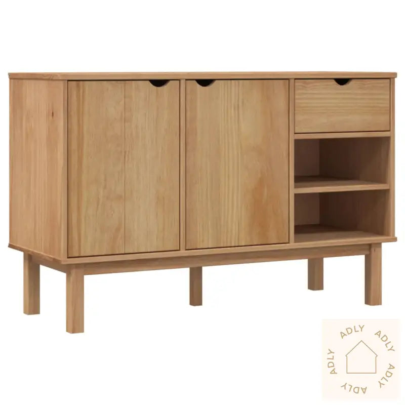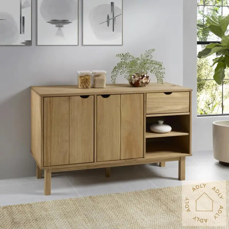Heltre furu: Laget av heltre furu, et slitesterkt og robust naturmateriale med karakteristiske årringer og naturlige kvister. Dette gir møbelet et unikt og rustikt preg som fremhever den nordiske stilen, og passer perfekt sammen med andre møbler til hjemmet ditt.Stabil ramme: Den solide trerammen gir ekstra holdbarhet og sørger for god stabilitet, slik at du kan stole på at møbelet varer i mange år.Rikelig med lagringsplass: Skjenken har 1 skuff og flere oppbevaringsrom bak dørene, noe som gir deg god plass til å organisere magasiner, bøker, DVD-er, multimedia og andre viktige ting. Hold alt samlet og lett tilgjengelig, enten i stua, spisestua eller på kontoret.Solid topp: Den flate og solide toppen er ideell for å sette frem dine favorittdekorasjoner, potteplanter eller innrammede bilder, slik at du kan gi rommet et personlig preg.ADVARSEL:
