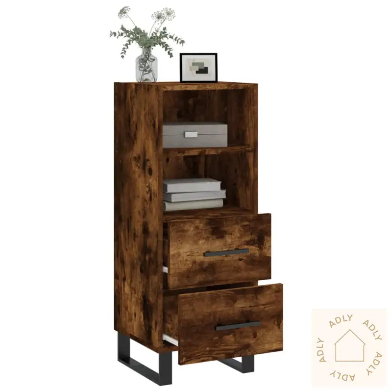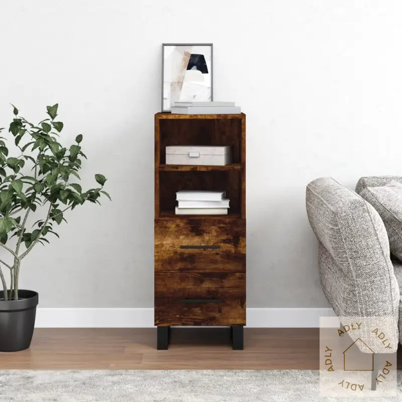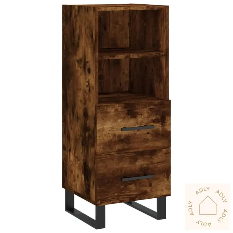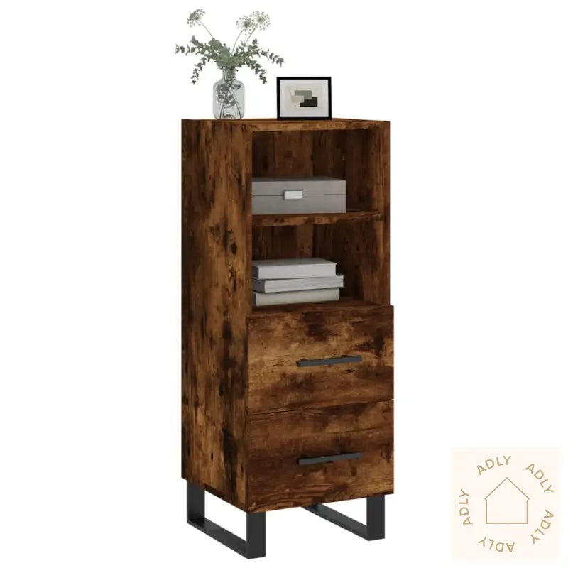 Slitesterkt materiale: Skjenken er laget av konstruert treverk med en jevn finish, kjent for sin styrke, stabilitet, holdbarhet og motstand mot fuktighet - noe som gjør dette møbelet ideelt for daglig bruk.Moderne metallben: Metallbena kompletterer designet med et moderne preg, samtidig som de gir god støtte og sørger for at skjenken står støtt på alle underlag.God oppbevaringsplass: Med to skuffer og to rom får du rikelig med plass til å organisere alt fra småting til viktige saker – perfekt for deg som ønsker ryddighet og enkel tilgang.Robust og stabil overflate: Toppen av skjenken egner seg utmerket til å vise frem dekorasjoner, familiebilder eller potteplanter og gir ekstra plass til å fremheve din personlige stil gjennom dine favorittmøbler.Advarsel: