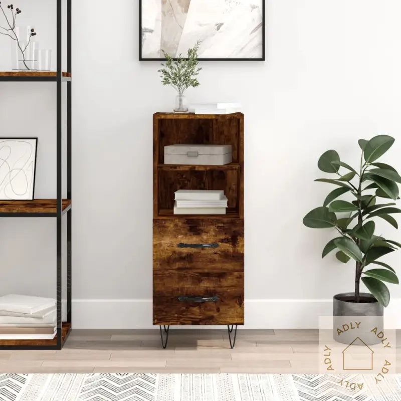 Slitesterkt materiale: Konstruert tre av høy kvalitet gir en jevn og elegant overflate, samtidig som det gir styrke, stabilitet og god motstand mot daglig slitasje og fukt. Perfekt for deg som ønsker robuste og langvarige møbler.Metallben: De solide metallbena gir skjenken et moderne løft og bidrar til et rolig uttrykk i interiøret, samtidig som de sikrer pålitelig stabilitet uansett hvor du plasserer den.Rikelig med oppbevaringsplass: Kombinasjonen av 2 skuffer og 2 åpne rom gjør det både enkelt og oversiktlig å organisere alt fra småting til større gjenstander – ideelt for å holde hjemmet ryddig og tingene lett tilgjengelige, akkurat som du forventer av praktiske møbler til hjemmet eller bokhyller og stående hyller.Stabil og robust topp: Den solide toppen på dette skapet egner seg ypperlig til å vise frem pyntegjenstander, bilder eller grønne planter, slik at du kan gi rommet ditt et personlig preg og fremheve din egen stil.Advarsel:
