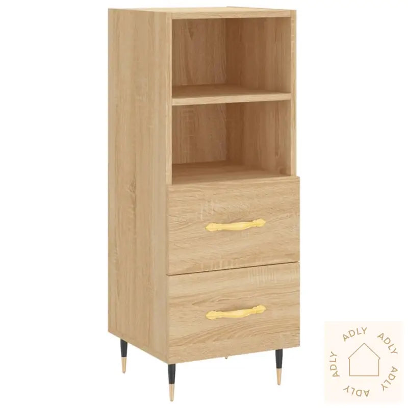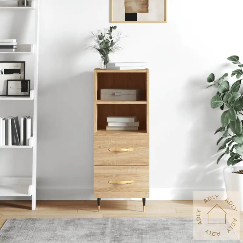 Slitesterkt materiale: Skjenken er laget av konstruert tre av høy kvalitet, kjent for sin glatte overflate samt styrke og stabilitet. Materialet har også god motstand mot fuktighet, noe som gir møblet varig holdbarhet – perfekt for deg som vil ha robuste sonoma eik-møbler som varer lenge.Moderne metallben: De minimalistiske metallbena gir skjenken en elegant og rolig stil, samtidig som de bidrar til økt stabilitet og slitestyrke for møbelet.God oppbevaringsplass: Med 2 praktiske skuffer og 2 åpne rom får du rikelig med plass til å holde favorittbøkene, viktige småting eller dekorative elementer organisert og lett tilgjengelig– ideelt for et ryddig hjem.Robust toppflate: Overflaten på skapet gir deg mange muligheter til å vise frem personlige detaljer, enten det er fotorammer, potteplanter eller annen pynt som løfter stemningen hjemme.Advarsel:
