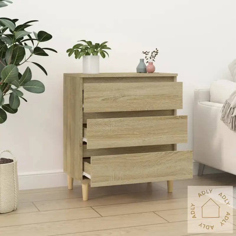 Slitesterkt materiale: Skjenken er laget av konstruert treverk av høy kvalitet som gir en jevn overflate og sørger for at møbelet holder seg pent over tid. Dette materialet er også kjent for sin styrke, stabilitet og gode motstandsdyktighet mot fukt – perfekt for hverdagsbruk.Rikelig med oppbevaringsplass: Med tre romslige skuffer får du masse plass til å organisere alt fra småting til større gjenstander. Alt du trenger i hverdagen er lett tilgjengelig, samtidig som du beholder et ryddig uttrykk i rommet.Solid topp: Overflaten på skjenken gir deg mulighet til å vise frem dine favorittdekorasjoner, bilder eller en frisk blomsterbukett. På denne måten blir møbelet også en personlig detalj som kan gi ekstra sjarme til rommet ditt.Treføtter: De solide treføttene i heltre eukalyptus gir både et naturlig preg og god stabilitet. Den varme tonen matcher mange ulike interiørstiler, og tilfører et komfortabelt og innbydende utseende.Advarsel: