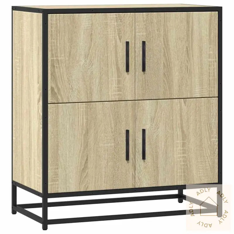 Den solide metallrammen gir oppbevaringsskapet ekstra styrke og lang levetid. Med sitt industrielle preg tilfører rammen et røft uttrykk i interiøret, samtidig som den gjør møbelet stabilt og motstandsdyktig mot slitasje og korrosjon – perfekt for aktive hjem.Det konstruerte treverket er kjent for å tåle både fuktighet og hverdagsslitasje. Overflaten er glatt, og materialet holder seg formstabilt uten å vri seg eller sprekke. Dette gir deg trygghet og gjør skjenken til et pålitelig valg av møbler til hjemmet i mange år fremover.Bufféen tilbyr godt med oppbevaringsplass til alt fra servise og glass til småting og andre husholdningsartikler. Du får enkelt orden og oversikt over det du trenger, med alt lett tilgjengelig, så rommet ditt fremstår ryddig.Praktiske håndtak gjør at dører og skuffer kan åpnes og lukkes komfortabelt. Håndtakene bidrar også til skjenkens elegante helhetsinntrykk og gjør bruken ekstra smidig i hverdagen.Sideskapet er allsidig og kan brukes på mange måter, enten du trenger ekstra plass på badet, kjøkken, soverom, gang eller hjemmekontor. Den nøytrale sonoma eik-fargen gjør at skapet passer sømløst sammen med ulike interiørstiler og møbler til hjemmet, også i spisestuen eller oppholdsrom.Advarsel: