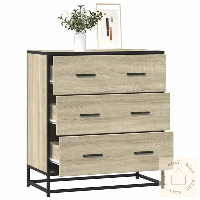 Den solide metallrammen gir oppbevaringsskapet ekstra stabilitet og lang levetid. Med den industrielle stilen og robuste utformingen får du et skap som både ser bra ut og tåler daglig bruk, samtidig som det motstår korrosjon og slitasje.Skjenken er laget av konstruert tre med en glatt, holdbar overflate. Dette materialet er kjent for å være både slitesterkt og stabilt, og motstår effektivt fuktighet, vridning og sprekker. Perfekt for deg som ønsker møbler til hjemmet som holder seg fine lenge.Du får god plass til oppbevaring takket være tre praktiske skuffer. Her kan du holde orden på alt fra bøker og papirer til servise eller annet du vil ha lett tilgjengelig og ryddig.Skapet leveres med praktiske håndtak som gir et godt og komfortabelt grep. De gjør det lett å åpne og lukke skuffene, samtidig som de er med på å fremheve det stilrene uttrykket.Advarsel: