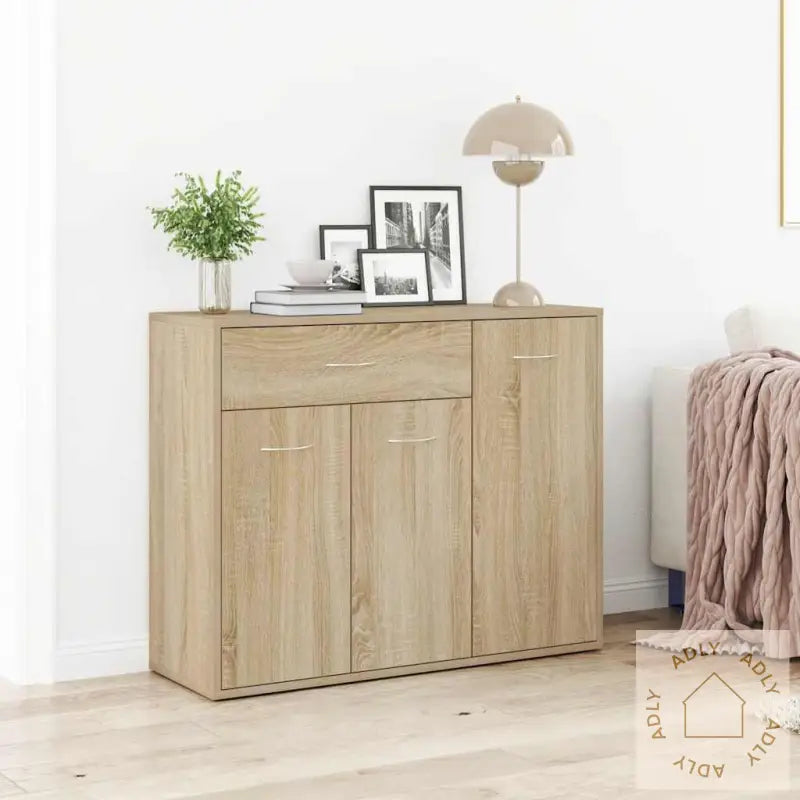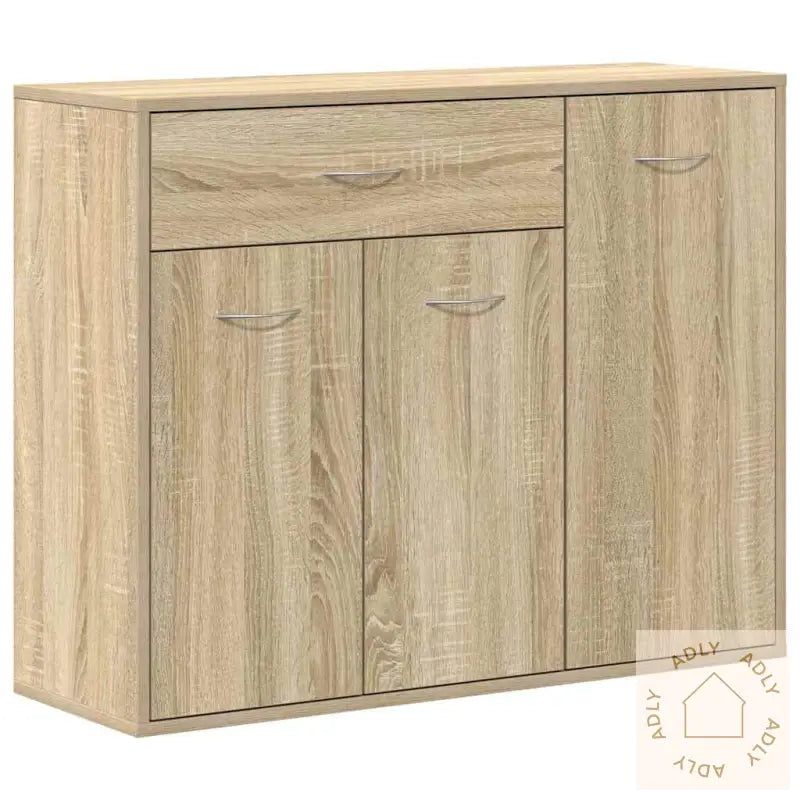 Skjenken er laget av kvalitetsrikt konstruert tre, noe som gjør den ekstra solid og slitesterk – perfekt for langvarig bruk. Med en romslig skuff og tre dører får du rikelig med lagringsplass til alt fra bøker, multimedieutstyr, og andre småting du ønsker å holde orden på. Den stabile toppen fungerer supert til å fremheve favorittdekor, familiebilder eller grønne potteplanter og setter et personlig preg på rommet.