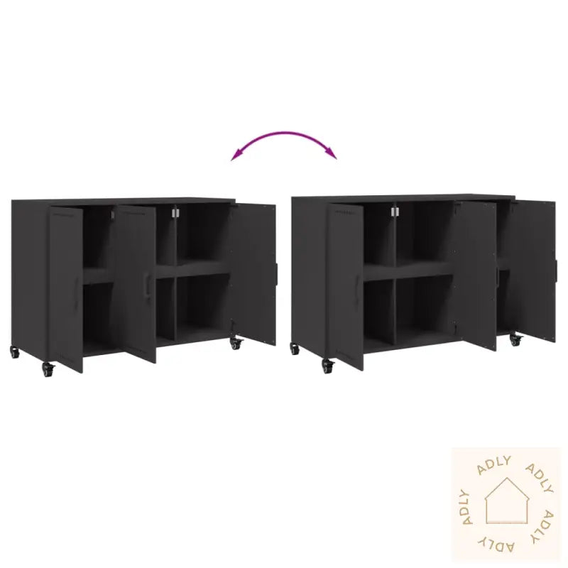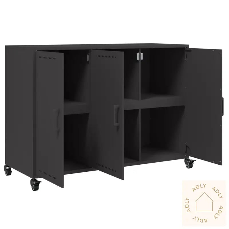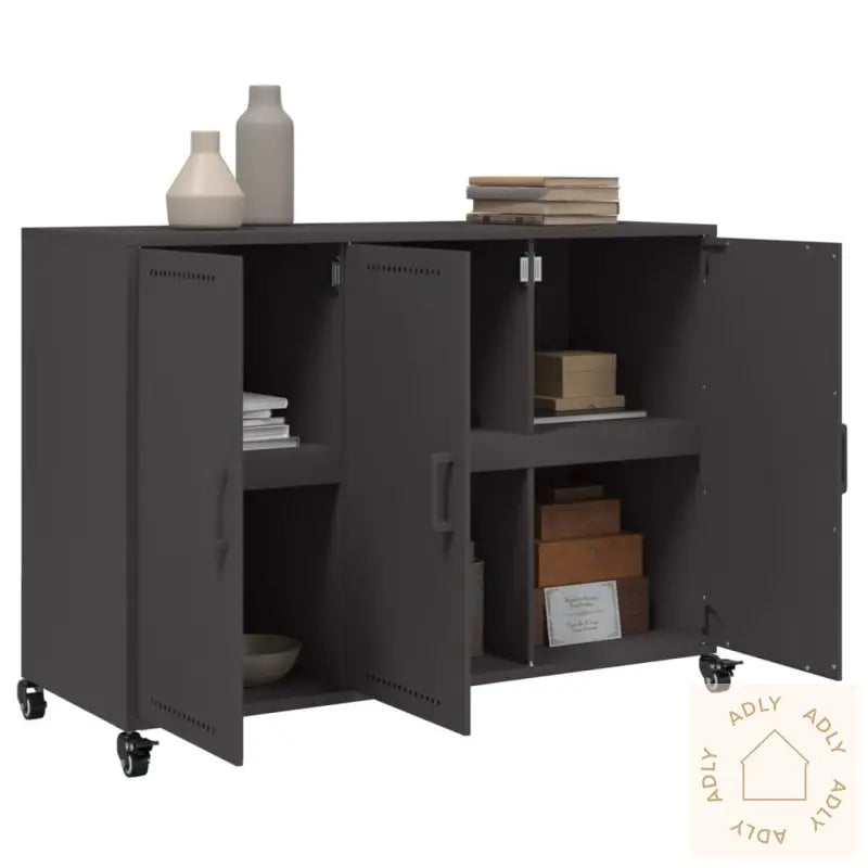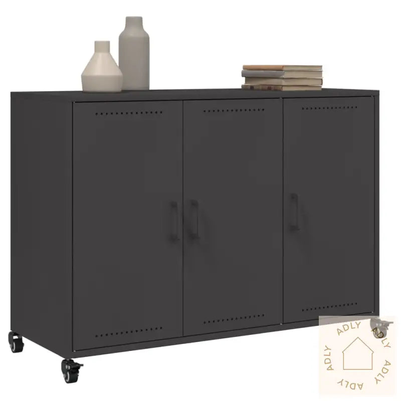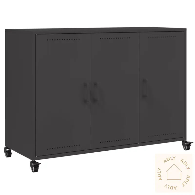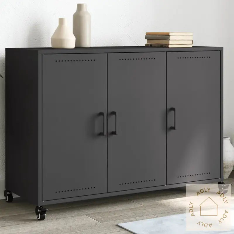 Slitesterkt materiale: Skjenken er laget av robust, kaldvalset stål, noe som gjør den svært holdbar og slitesterk. Stål gir god stabilitet, tåler daglig bruk og holder seg pen over tid – ideelt for deg som ønsker kvalitetsmøbler. Den glatte overflaten sørger for en moderne look som glir sømløst inn sammen med andre møbler.Rikelig med oppbevaringsplass: Med smarte hyller bak tre dører får du rikelig plass til å organisere magasiner, bøker, fjernkontroller og alle småtingene som ellers lett blir liggende rundt. Dette gjør den superpraktisk både på stua, soverommet eller kontoret.Enkel å vedlikeholde: Du kan enkelt holde skjenken ren ved å tørke over med en fuktig klut. Materialet krever minimalt vedlikehold og passer perfekt for en aktiv hverdag hvor du vil bruke tiden på andre ting enn rengjøring.Lett å flytte: Skjenken står på fire hjul, slik at du enkelt kan trille den dit du trenger den, enten det er i stua, gangen eller blant dine andre hagemøbler. Hjulene gjør det også lett å parkere den stødig på ønsket plass.Farge: svartMateriale: kaldvalset stålMål: 100,5 x 39 x 72 cm (L x B x H)Med 3 dørerMontering kreves: ja