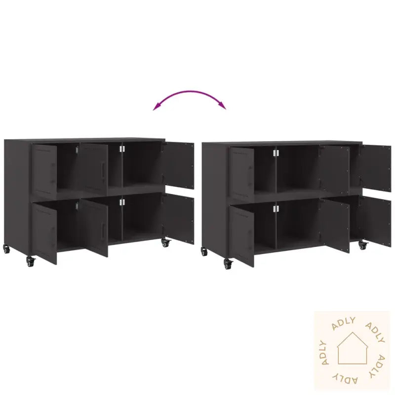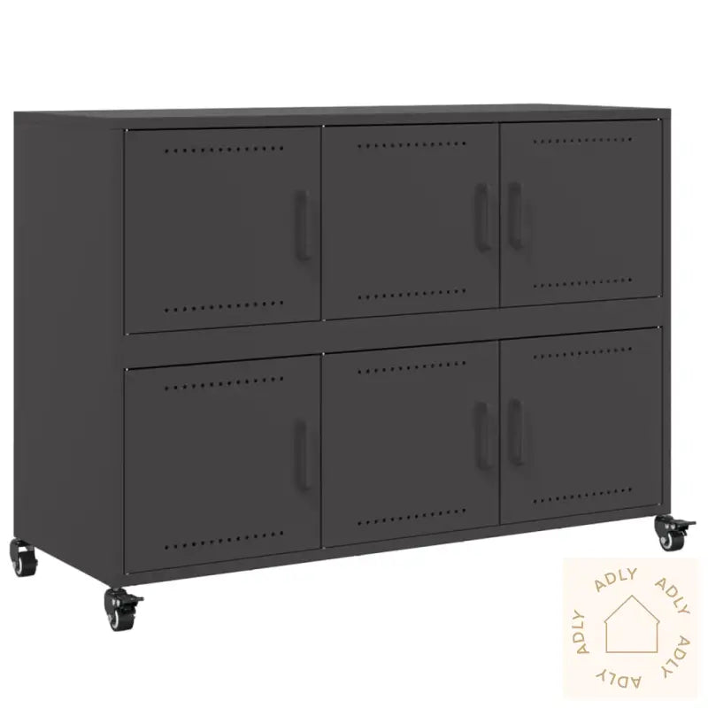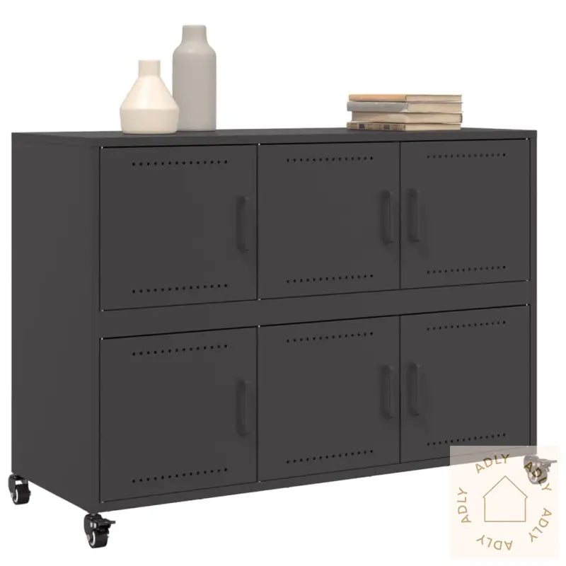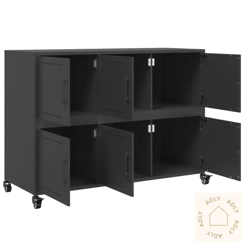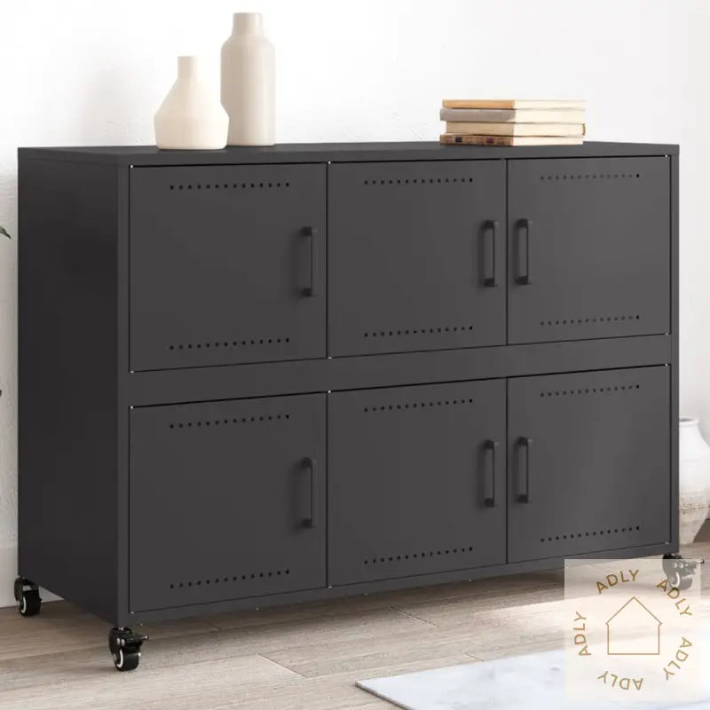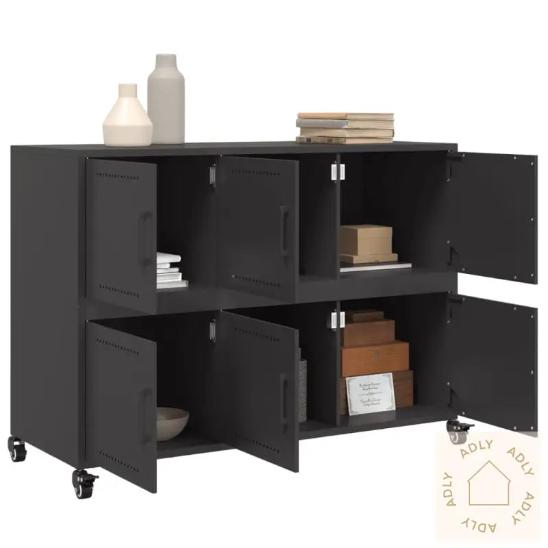 Slitesterkt materiale: Skapet er laget av kaldvalset stål, kjent for sin usedvanlige styrke og holdbarhet. Med dette materialet får du et robust møbel som tåler daglig bruk, samtidig som det ser moderne ut og har høy dimensjonsnøyaktighet. Den glatte overflaten bidrar både til et minimalistisk preg og enklere rengjøring.Rikelig med oppbevaringsplass: Skjenken tilbyr god plass for å organisere magasiner, bøker, fjernkontroller, spill og småting. Med seks romslige dører holder du enkelt orden på sakene dine og får et ryddig hjem.Enkel å vedlikeholde: Du trenger kun en fuktig klut for å holde skjenken pen, noe som sparer deg for tid og gir deg mer tid til å nyte hjemmets andre møbler.Lett å flytte: De fire solide hjulene gjør at skjenken kan flyttes enkelt rundt i rommet. Du kan for eksempel bruke den som en fleksibel lagringsløsning der du måtte trenge det, enten i stua eller sammen med andre bokhyller og stående hyller.Farge: SvartMateriale: Kaldvalset stålMål: 100,5 x 39 x 72 cm (L x B x H)Med 6 dørerMontering kreves: Ja