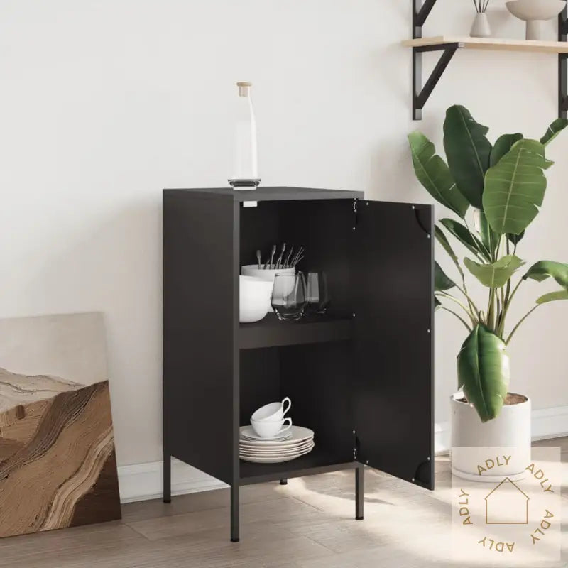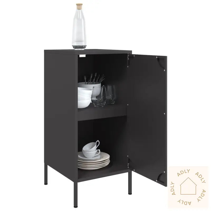 Stabilt materiale: Rammen er laget av kvalitetsrikt kaldvalset stål. Dette lavkarbonstålet produseres ved kaldvalsing nær romtemperatur, noe som gir skjenken høyere styrke, en glatt og fin overflate, og ekstra god presisjon. Kaldvalset stål sørger for langvarig holdbarhet og robusthet i daglig bruk.God oppbevaringsplass: Skjenken har praktiske romslige hyller hvor du enkelt får plass til alt fra magasiner, bøker og DVD-er til fjernkontroller og små nødvendigheter. Alt holdes lett tilgjengelig, men samtidig pent ryddet bort.Justerbare skrueføtter: Med 4 justerbare skrueføtter får skjenken stabilitet på alle typer gulv, selv om underlaget er ujevnt. Dette gir balanse, beskytter gulvet, og gjør at møbelet står stødig til enhver tid.Praktiske dører: Den solide døren lar deg raskt skjule småting og holde rommet rent og organisert. Du får en mer ryddig look uten rot og distraksjoner.Enkel rengjøring: Takket være overflater i metall og kaldvalset stål kan skapet lett tørkes av med en fuktig klut. Det krever minimalt med vedlikehold, slik at du sparer tid.Advarsel: