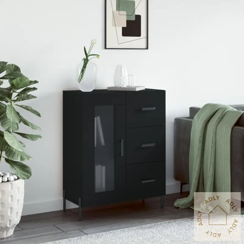 Solid materiale: Skapet er laget av konstruert treverk av høy kvalitet med en glatt overflate. Dette materialet gir styrke og stabilitet, samt motstand mot fukt, som sikrer at dine møbler holder seg pene lenge.Rikelig oppbevaring: Med tre romslige skuffer og to hyller bak glassdører får du god plass til å oppbevare alt fra servise til bøker og småting. Alt holdes ryddig og lett tilgjengelig, og du får en praktisk løsning uten rot.Utstillingsplass: Den solide topplaten gir deg mulighet til å vise fram favoritt-gjenstander, fotografier eller grønne planter. Skjenken er et naturlig blikkfang, og fungerer perfekt sammen med andre stående hyller og bokhyller.Praktisk dør: Glassdøren beskytter innholdet mot støv samtidig som du lett ser hva som er inni, slik at det blir både oversiktlig og rent uten unødvendig leting.Metallføtter: De stilrene metallføttene gir skapet et moderne og rolig preg, samtidig som de sørger for ekstra stabilitet og lang holdbarhet.Advarsel:
