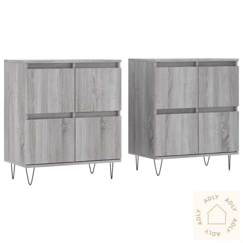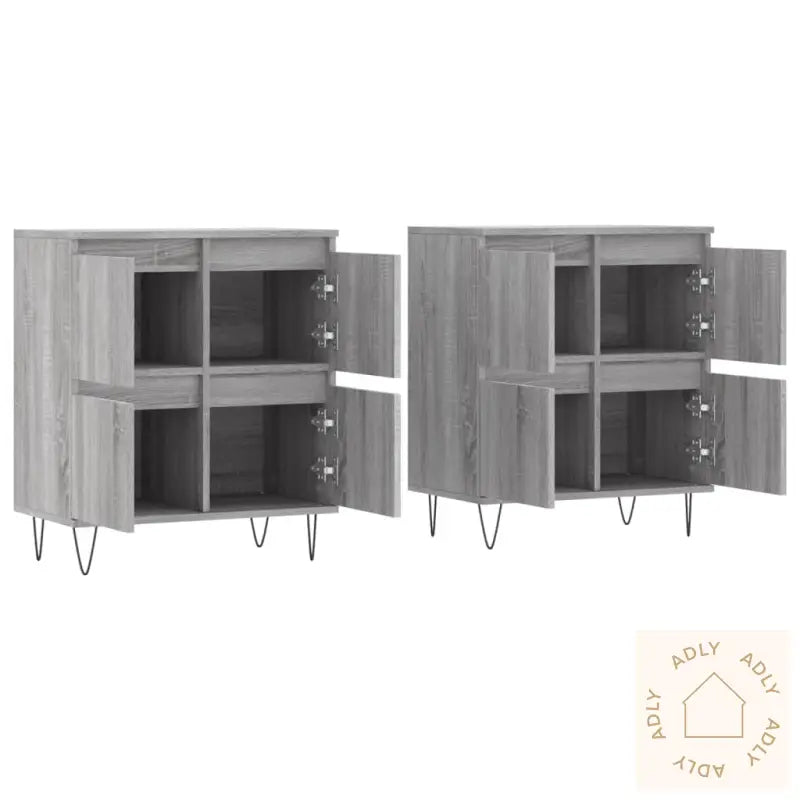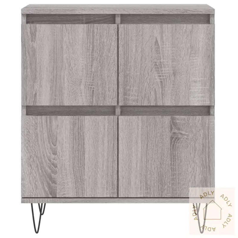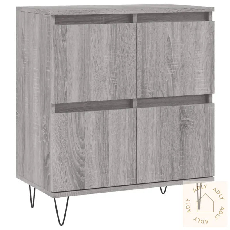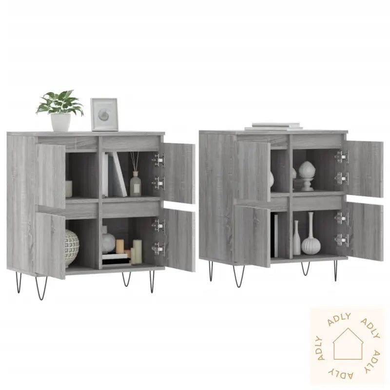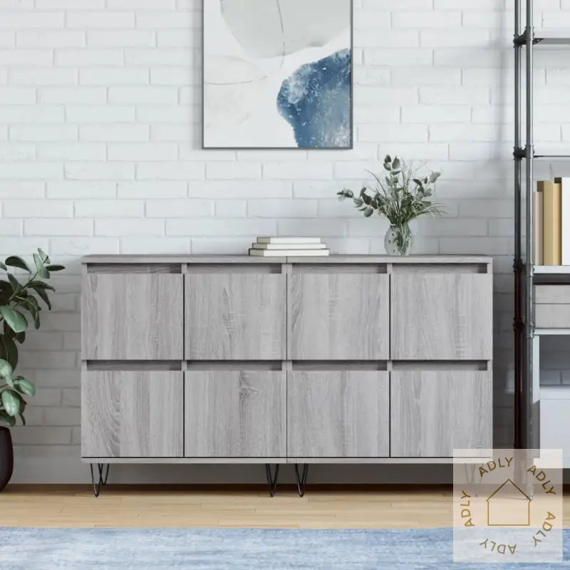 Slitesterkt materiale: Skjenkene er laget av konstruert treverk av høy kvalitet. Dette materialet gir ikke bare en jevn og elegant overflate, men sørger også for god styrke, slitestyrke og stabilitet, i tillegg til at det tåler fuktighet. Du får solide møbler som holder lenge og er enkle å rengjøre.Rikelig med lagringsplass: Med god plass til oppbevaring hjelper disse skapene deg å få orden på alt fra servise og glass til bøker, elektronikk og dine andre daglige nødvendigheter. Alt holdes pent organisert og alltid lett tilgjengelig.Visningsfunksjon: Den store, stabile toppen er ideell for å vise frem favorittbildene dine, dekorasjoner, planter eller blomster. Dette gir rommet ditt et personlig preg og skaper en hyggelig atmosfære – perfekt for å sette frem nips og grønne planter som gjør boligen ekstra innbydende.Disse møblene til hjemmet kombinerer funksjon og stil, og gjør rommet mer innbydende samtidig som de hjelper til med å holde det ryddig. Skjenkene leveres i en moderne grå sonoma-farge, som er enkelt å matche med både fargesterke og nøytrale innredninger. Solid metall brukes til enkelte detaljer, og alt er utformet for enkel montering og langvarig bruk.