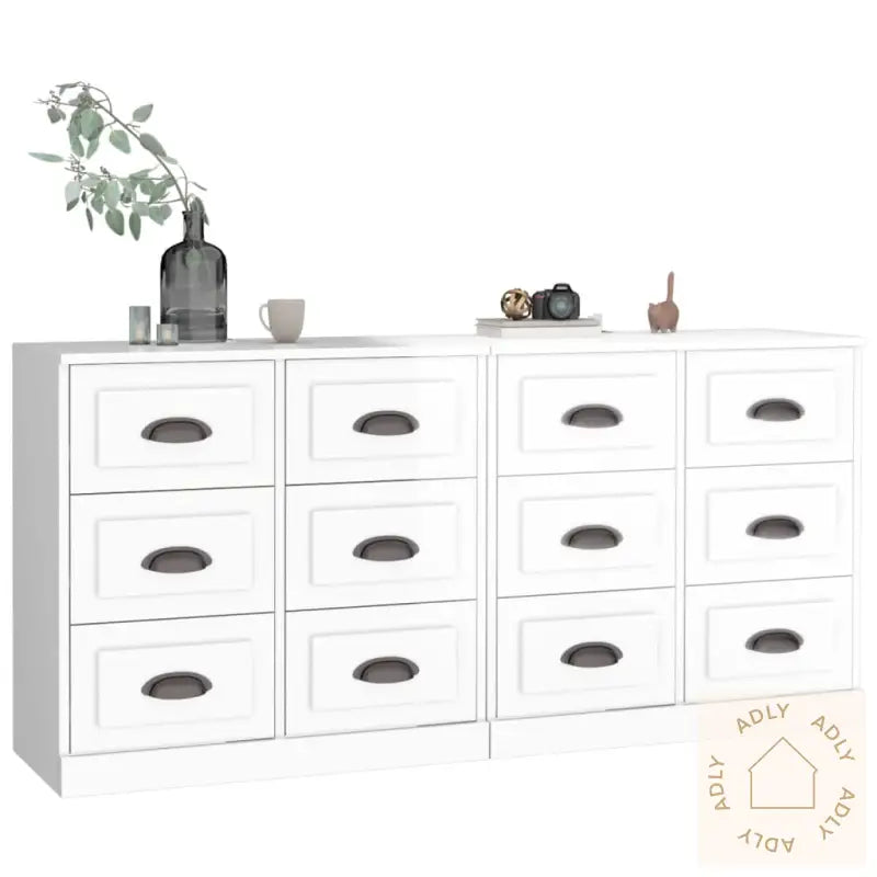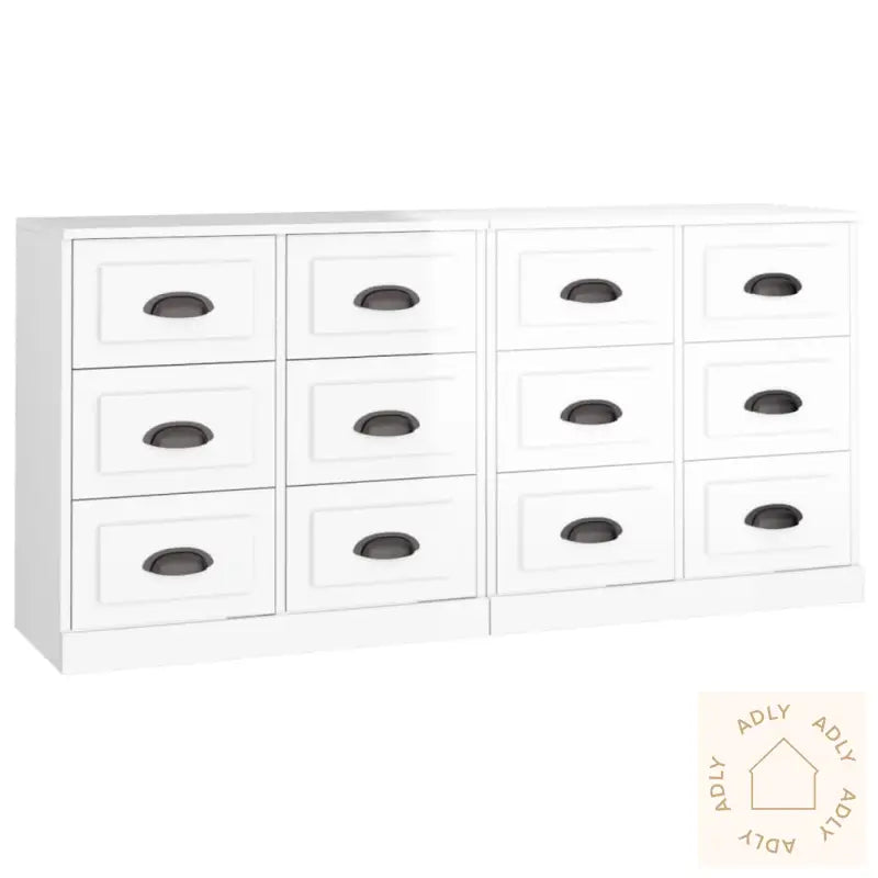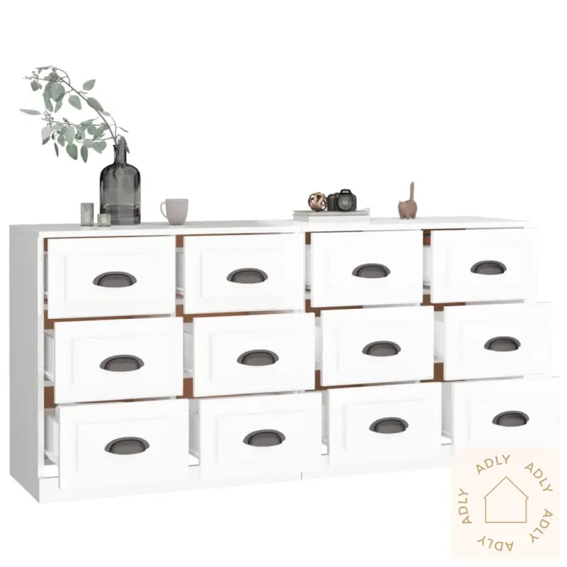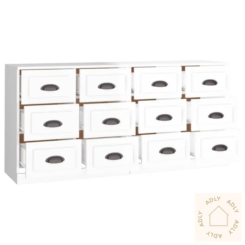Slitesterkt materiale: Skjenkene er laget av konstruert treverk av høy kvalitet, noe som gjør dem robuste og motstandsdyktige mot fuktighet. Den glatte overflaten gir et elegant uttrykk og gjør at møblene holder seg fine lenge.Rikelig med lagringsplass: Her får du god plass til å oppbevare alt fra servise til bøker og hverdagslige nødvendigheter. Dette gjør det enkelt å holde hjemmet ryddig og ting lett tilgjengelig, enten du bruker de som bokhyller og stående hyller eller til annen organisering.Visningsfunksjon: Den solide toppen gir deg muligheten til å vise frem dine favorittbilder, dekorative gjenstander eller blomsterpotter. Dette bidrar til å skape en personlig atmosfære, og gir ekstra liv til rommet – perfekt når du ønsker å friske opp innredningen med nye møbler.Advarsel: