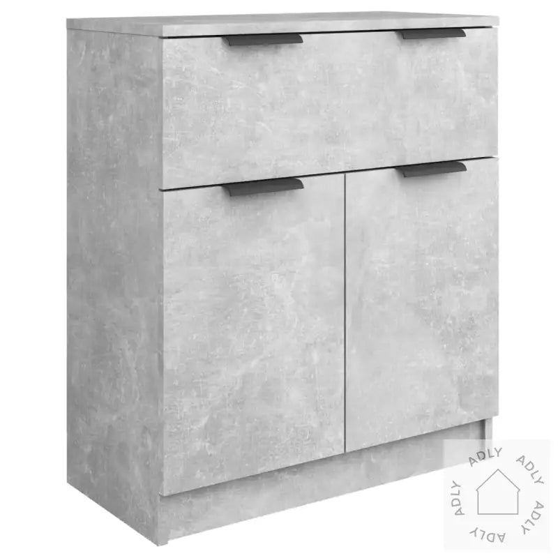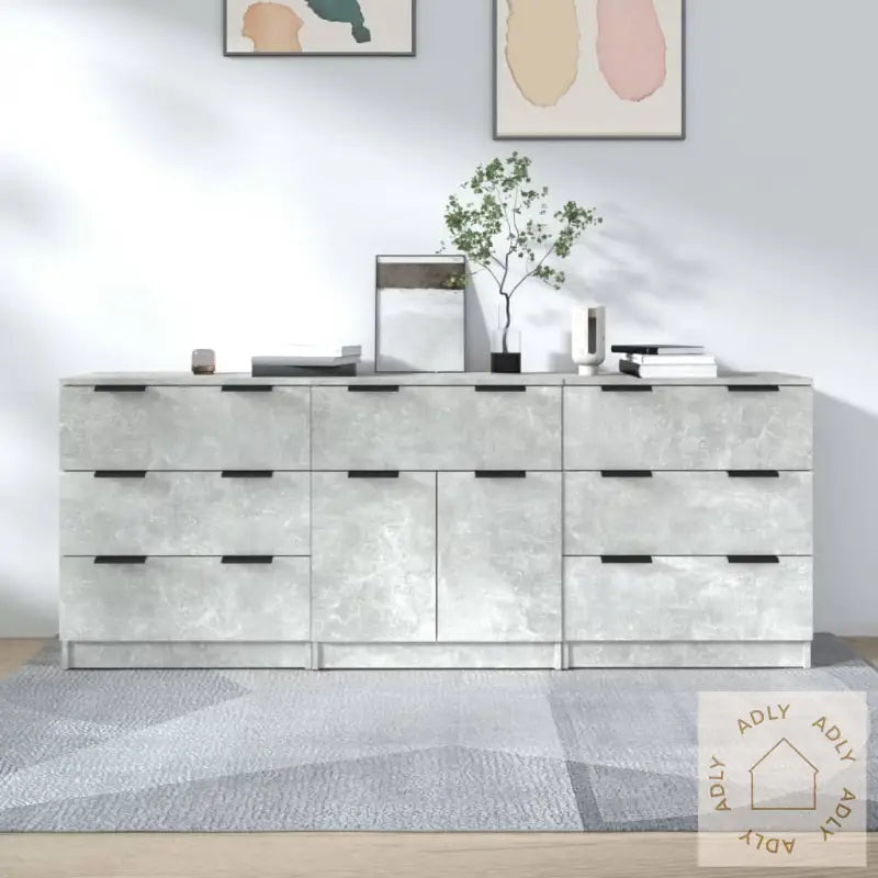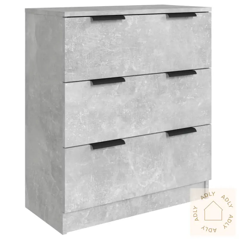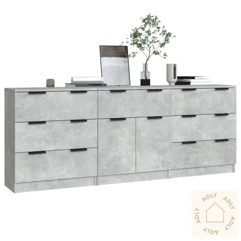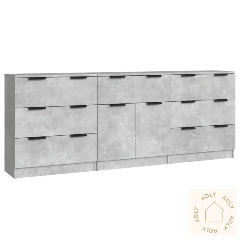 Alle produktene leveres med enkel og tydelig monteringsveiledning som gjør montering rask og grei.Farge: betonggråMateriale: konstruert treMål (hver): 60 x 30 x 70 cm (B x D x H)Leveransen inneholder:2 x skjenker (med 3 identiske skuffer hver)1 x skjenk (med skuffer)Juridiske dokumenter:
